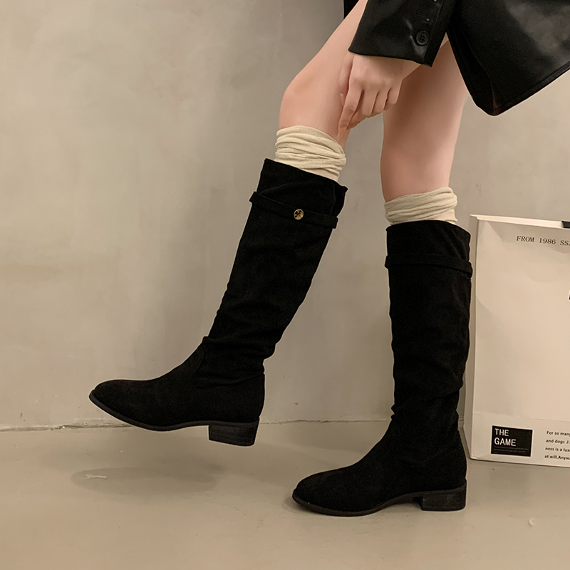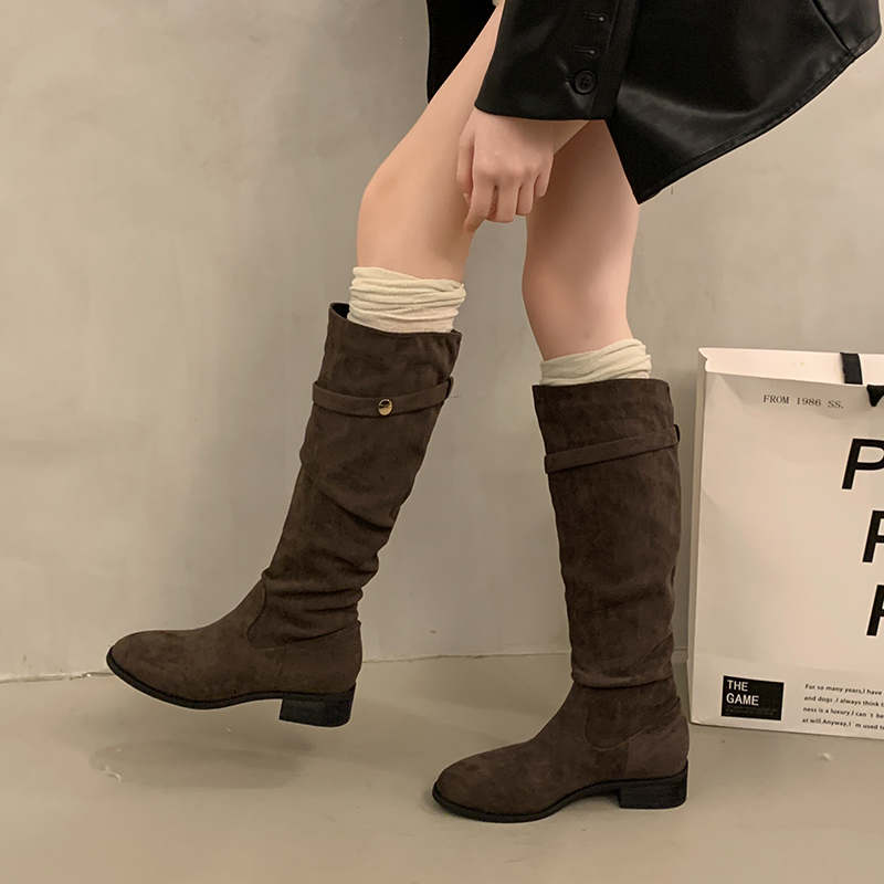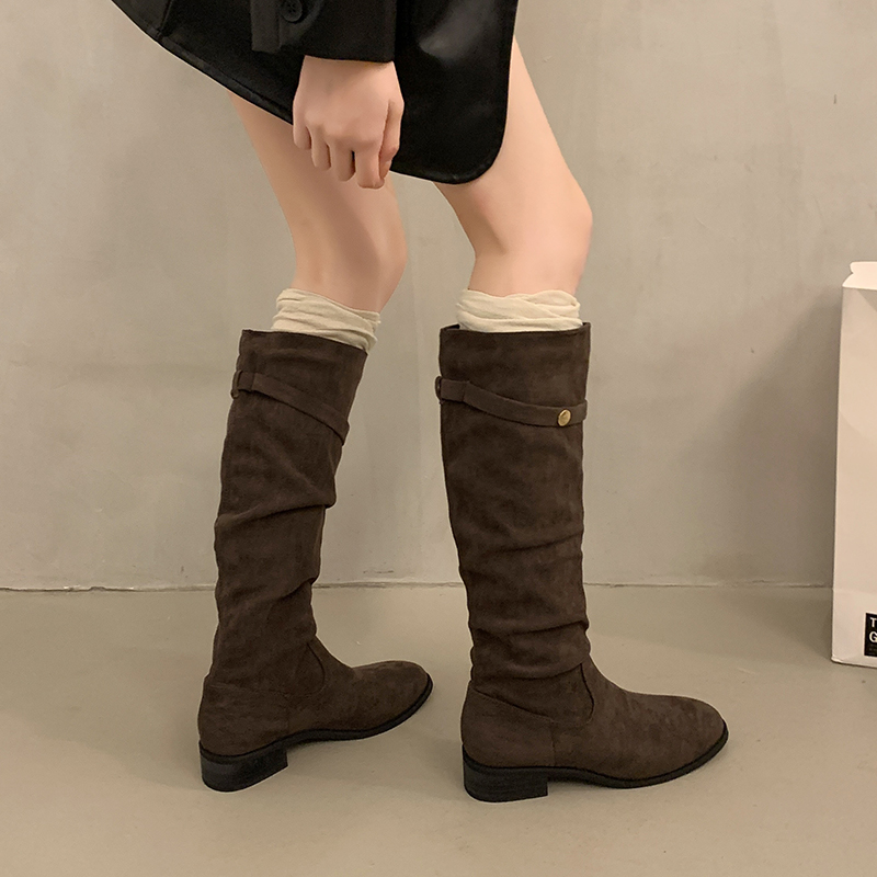 高跟绒面尖头堆堆靴中筒骑士靴女靴子2025秋冬季棕色长筒瘦瘦长靴