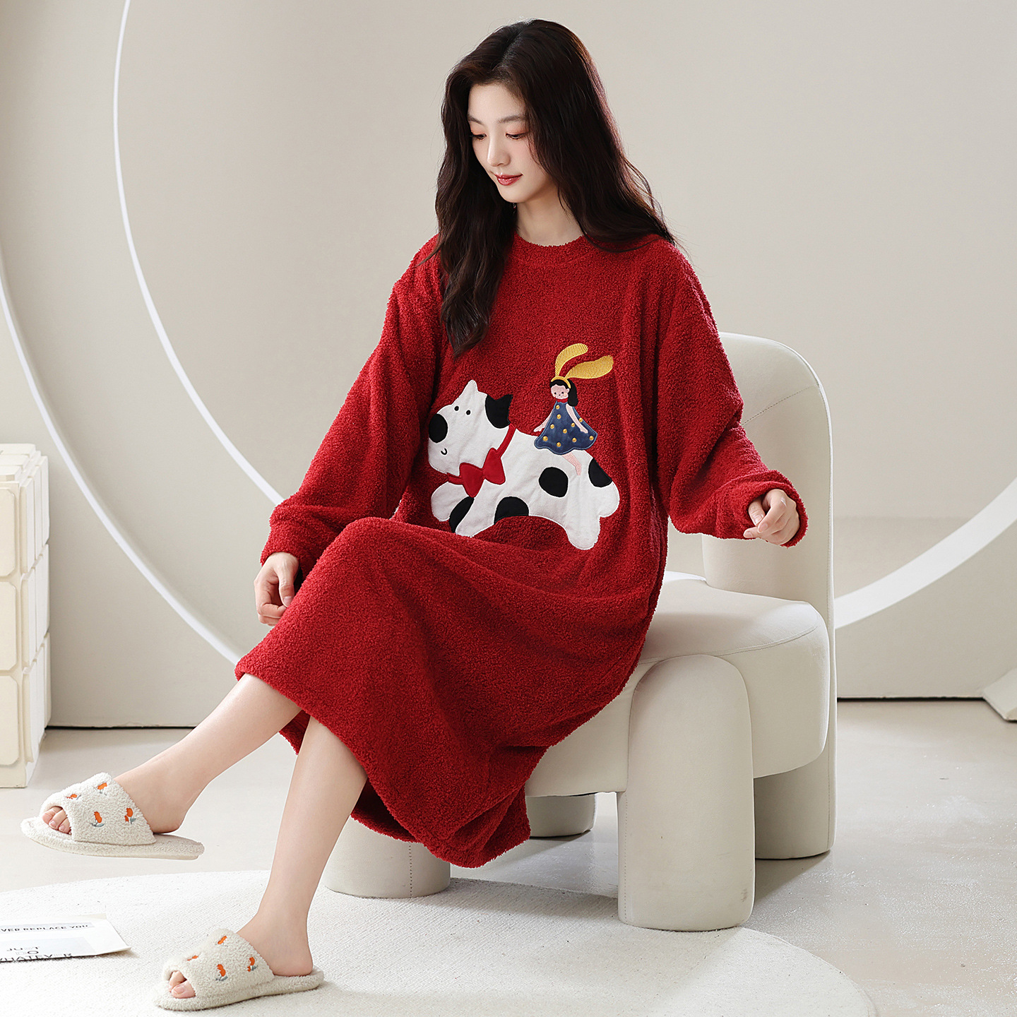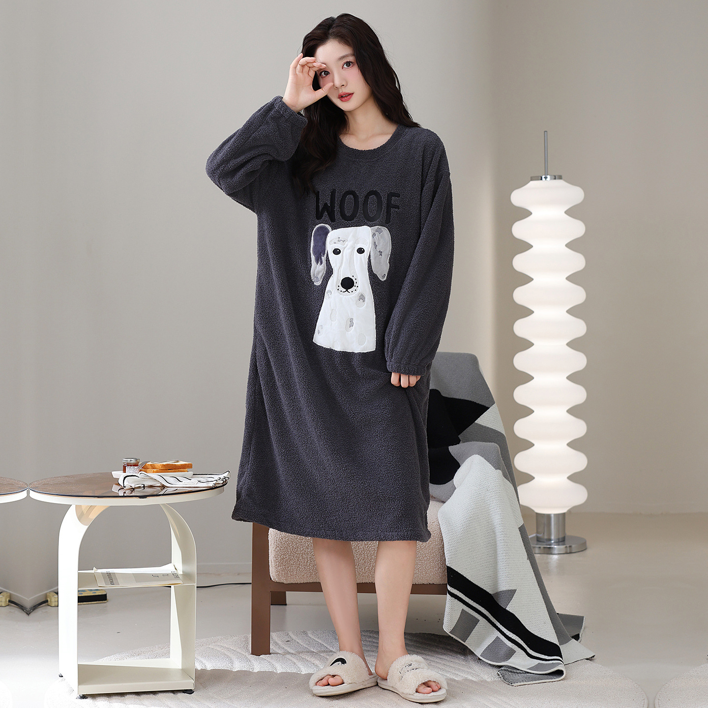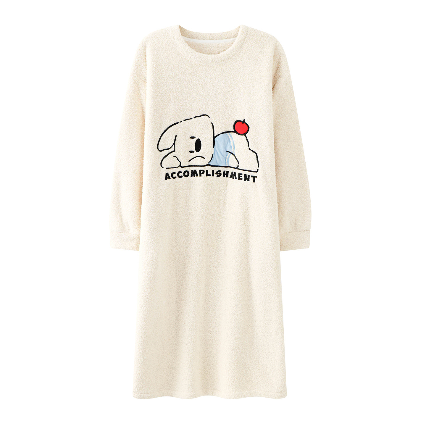 冬季半边绒睡裙加厚保暖休闲宽松中长款睡衣女长袖裙子卡通家居服
