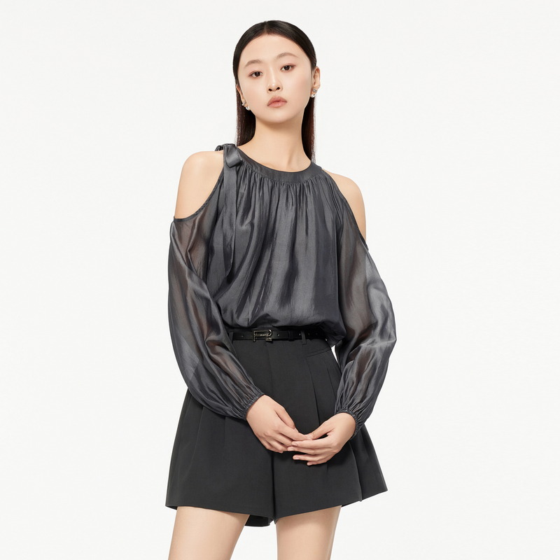 飘蕾露肩长袖雪纺衫女2025夏季