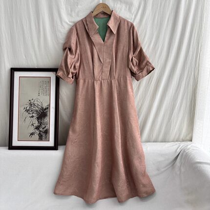 *100桑蚕丝 香云纱 夏季新高级感剪刀领暗纹印花连衣裙14H4/10731