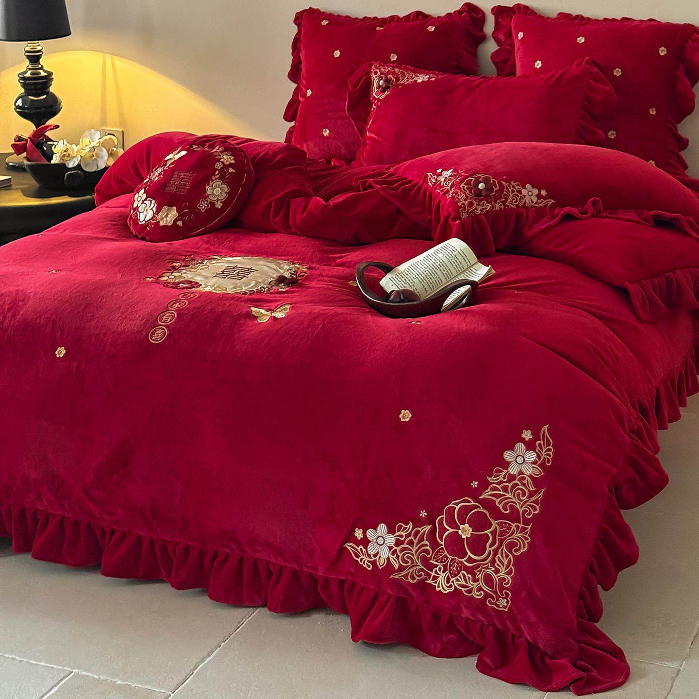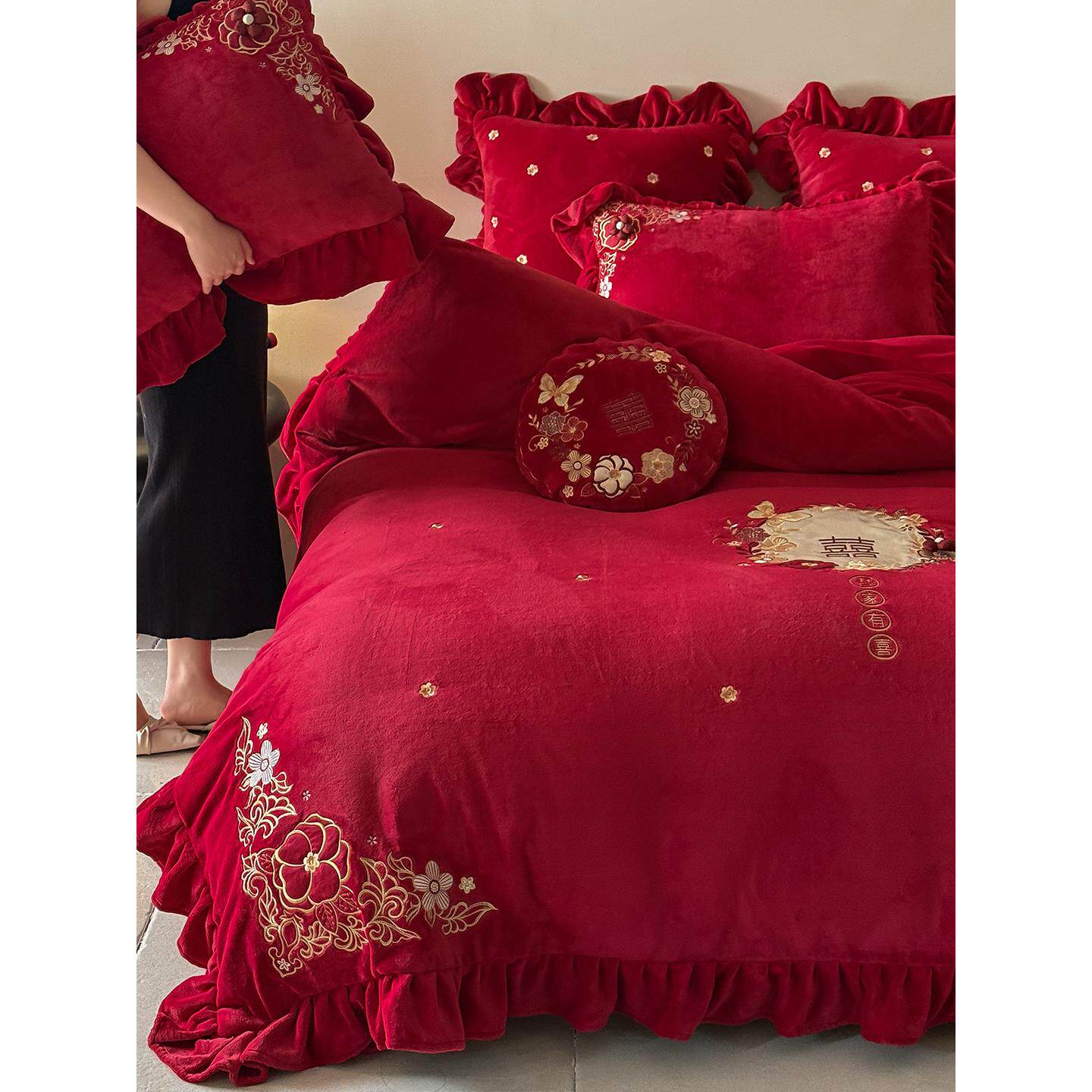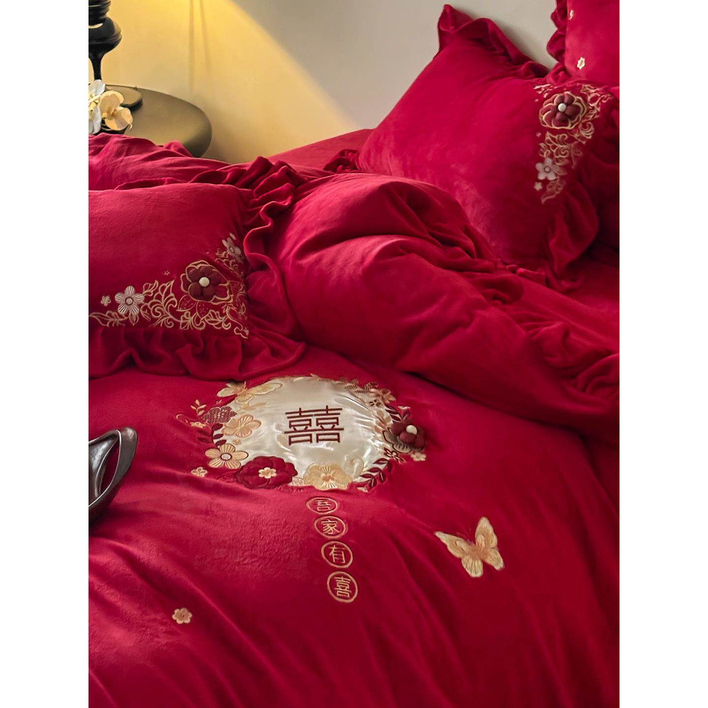 喜气满满婚庆牛奶绒秋冬款四件套红色结婚珊瑚绒加厚被套保暖床单