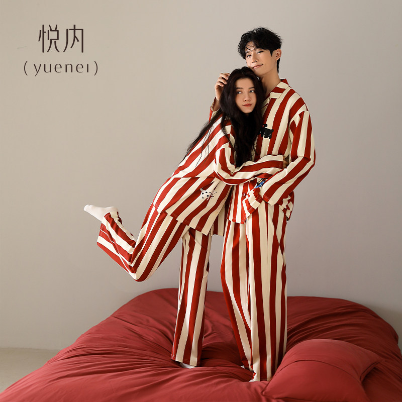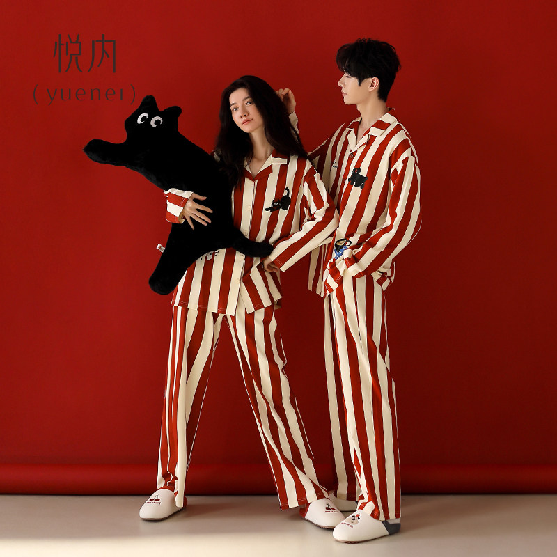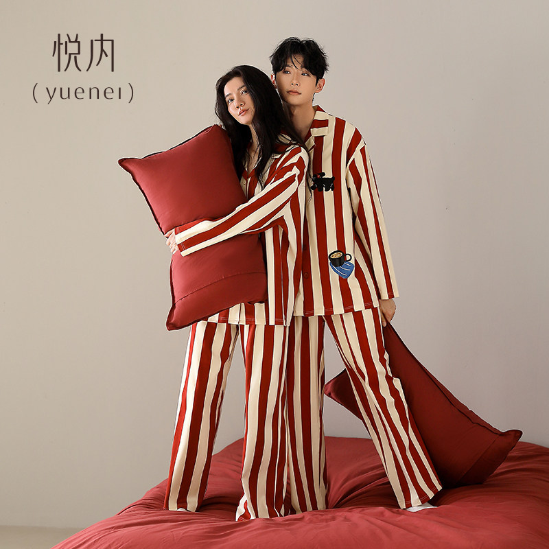 悦内情侣睡衣女款春秋季秋冬长袖纯棉家居服男士大红色本命可外穿