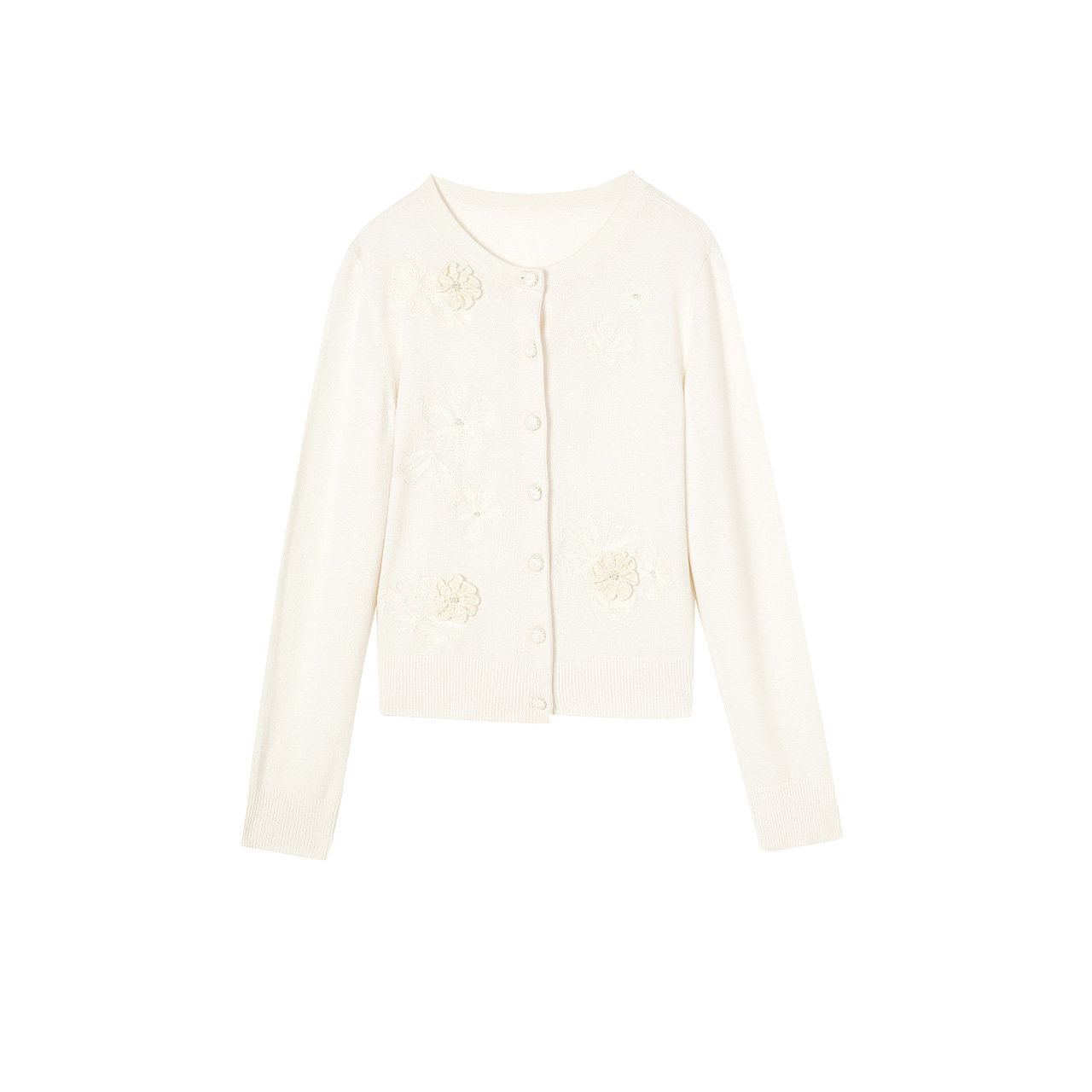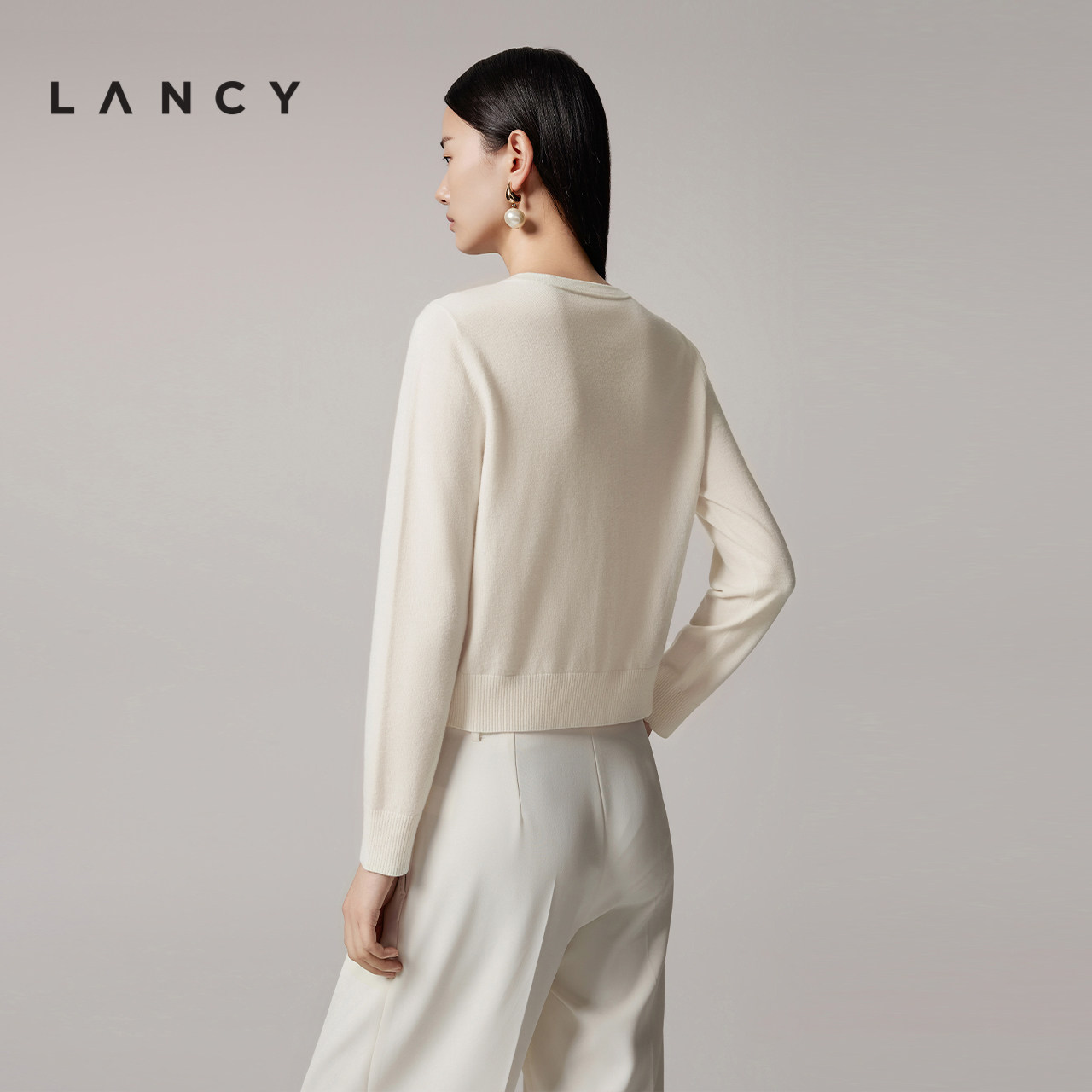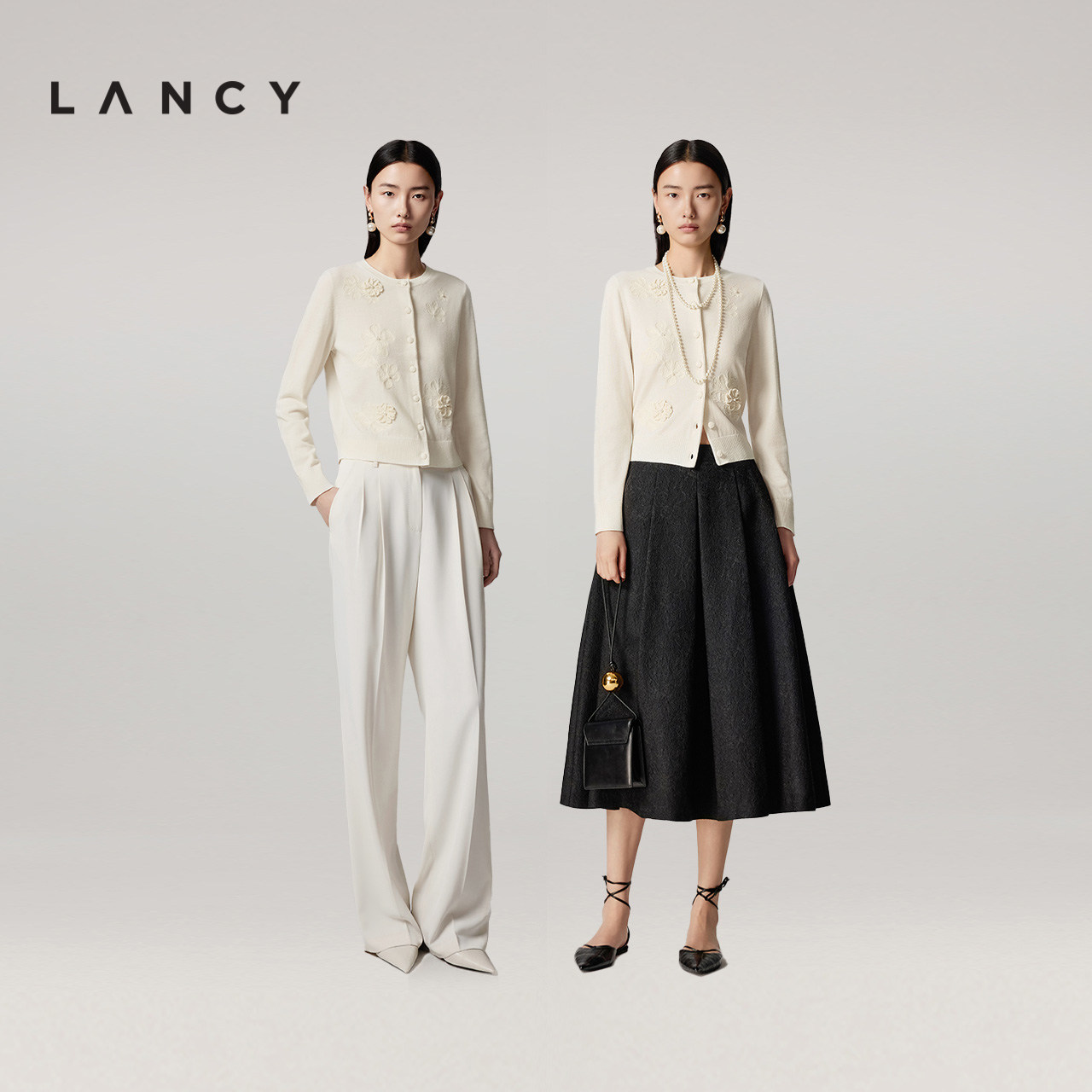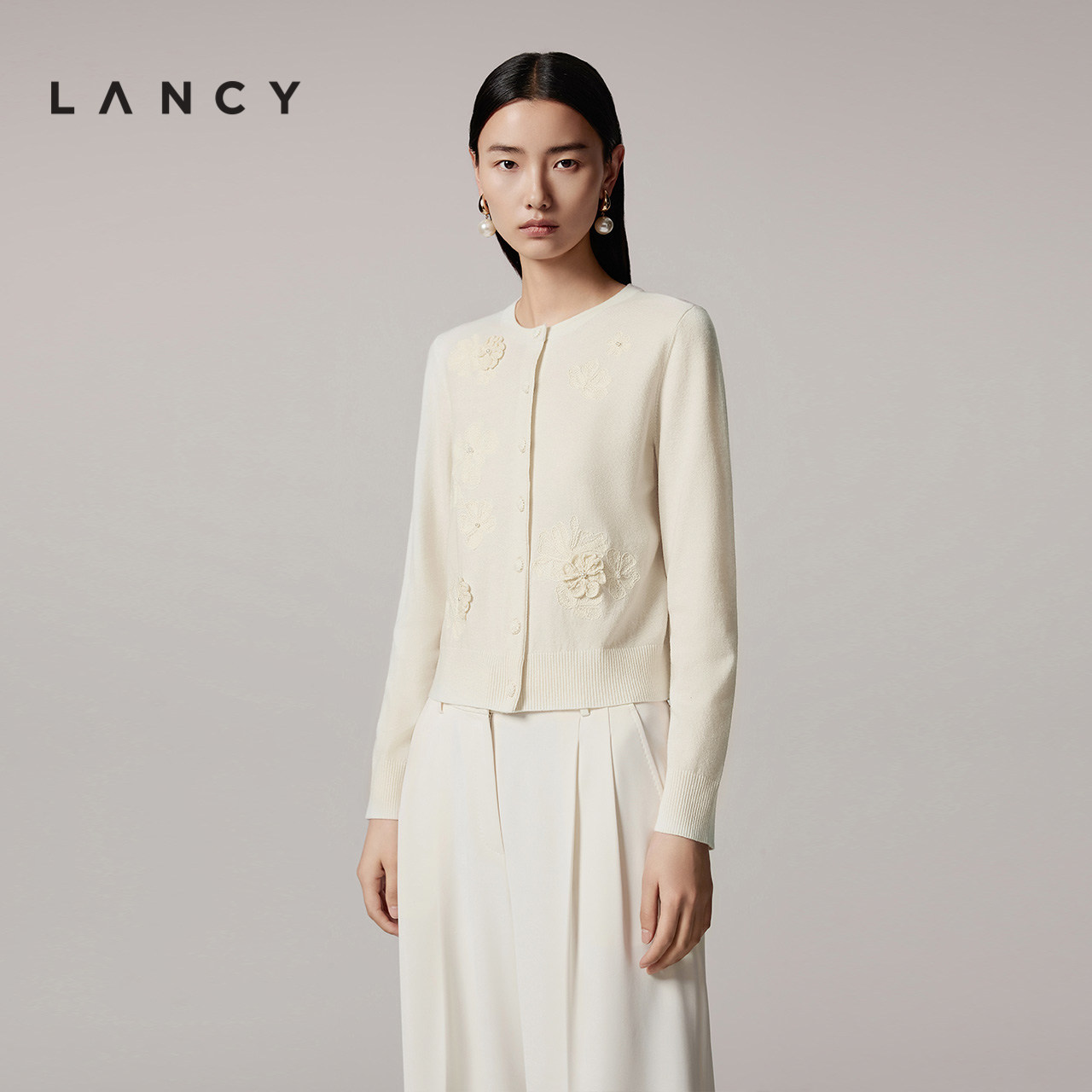 LANCY/朗姿2025年秋新款法式优雅钩绣花卉羊毛羊绒圆领针织开衫女