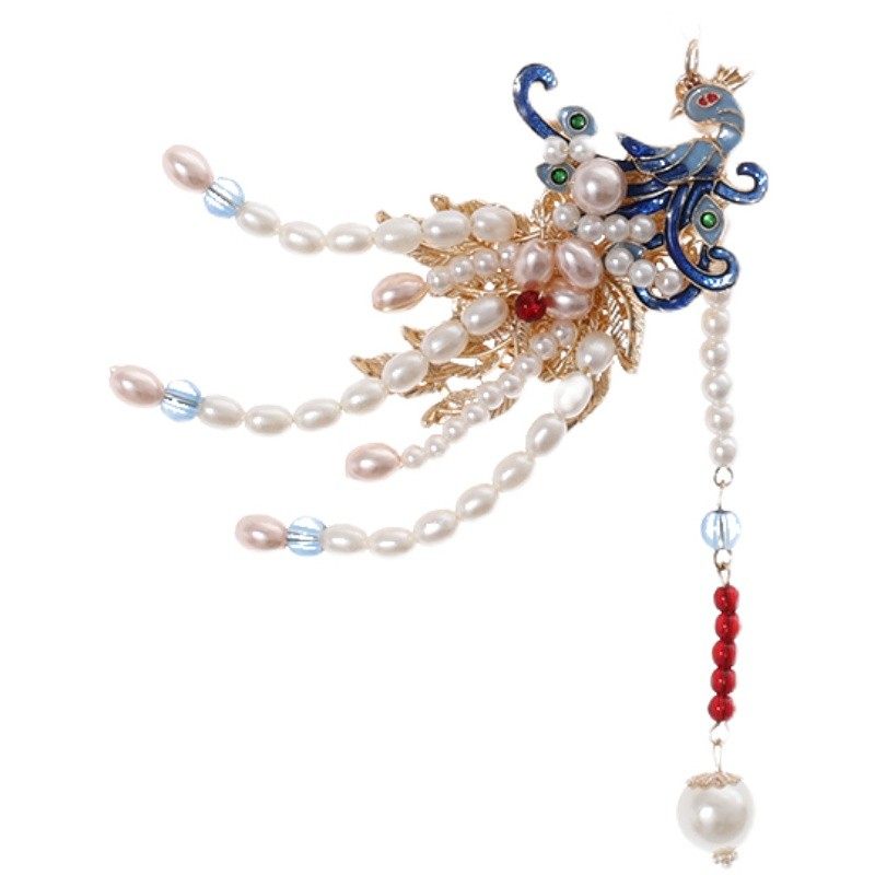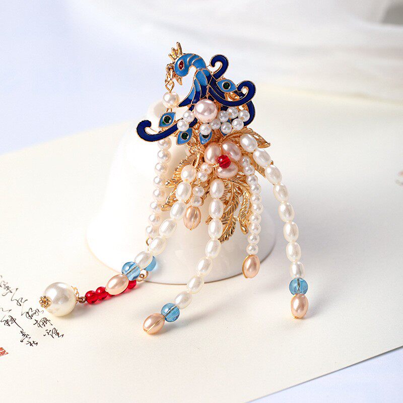 儿童汉服头饰凤凰珍珠烧蓝发夹古风景泰蓝边夹流苏步摇古装发饰品