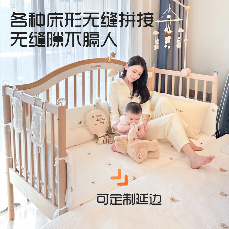 儿童拼接床高低可调婴儿实木加宽床大人可睡定制围栏可升降榉木床