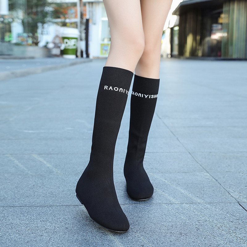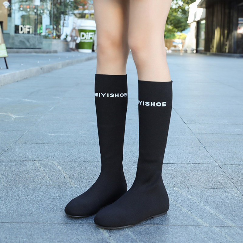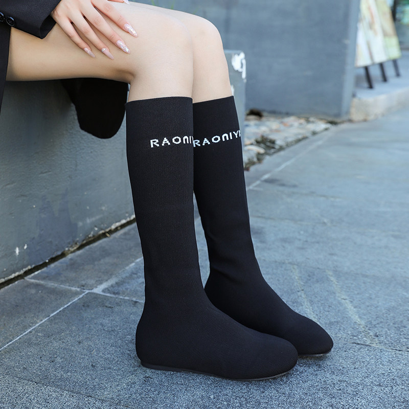 英伦风字母马面裙靴女平底春秋新款弹力针织瘦瘦靴低跟飞织高筒靴