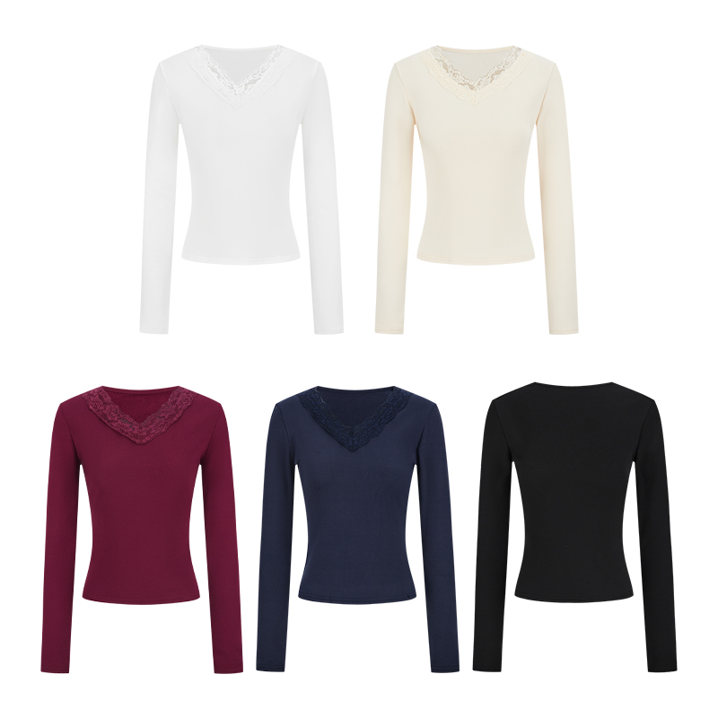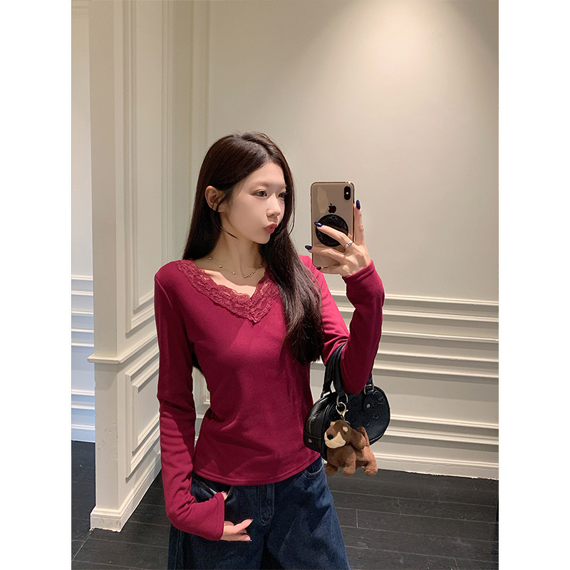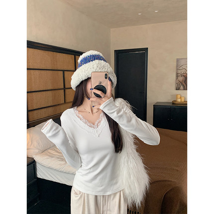 MosesQueen魔西女王白色v领蕾丝长袖t恤秋冬加绒加厚打底衫上衣女
