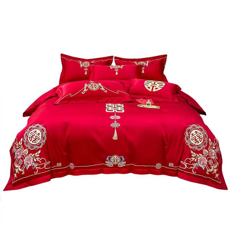 高档中式全棉结婚四件套大红色床单被套纯棉婚庆床上用品婚房喜被