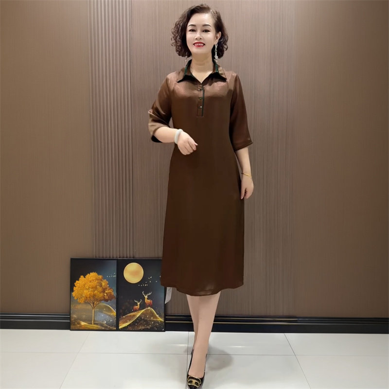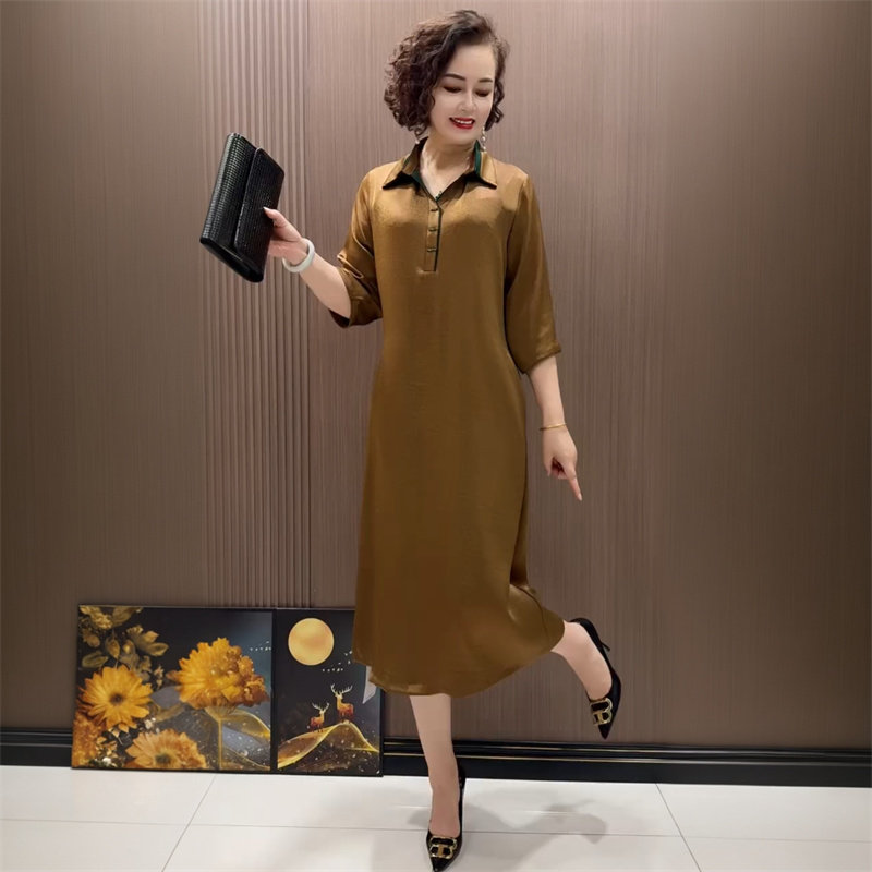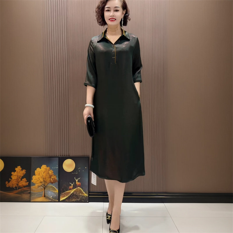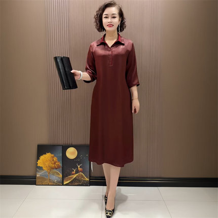 高端中老年妈妈真丝连衣裙夏季国风翻领中长款遮肉大码桑蚕丝裙子