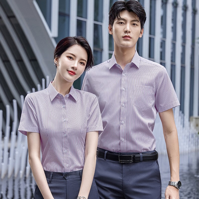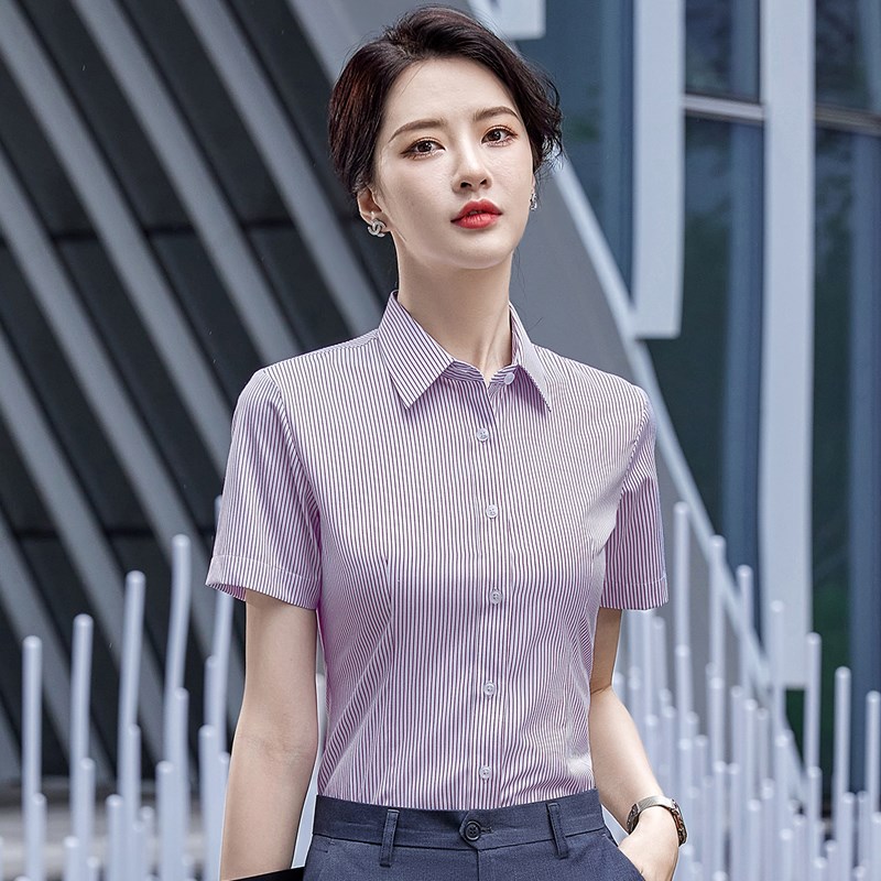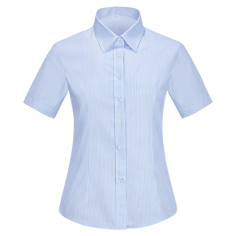 蓝色条纹衬衫女短袖夏季气质农业银行工作服正装免烫销售职业衬衣