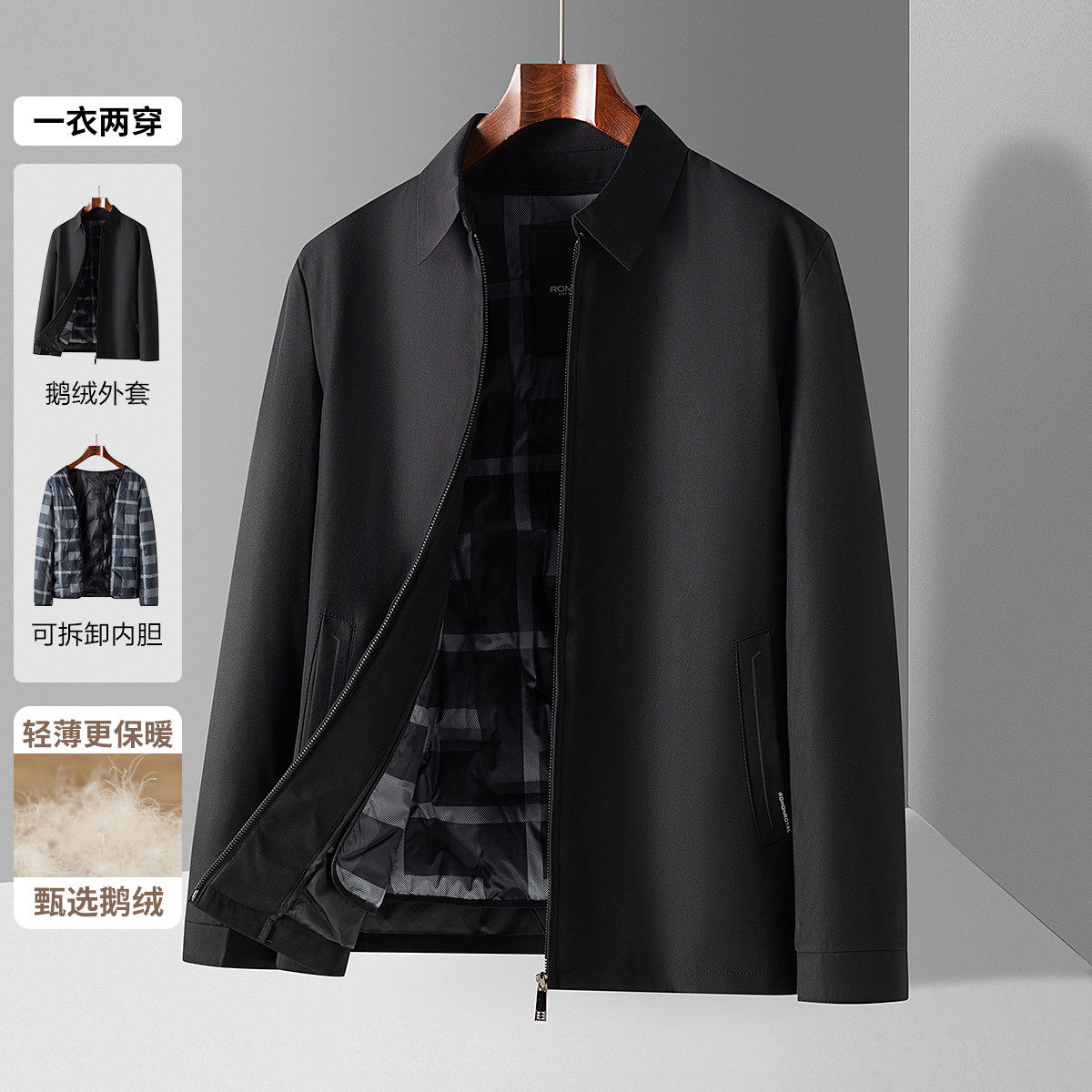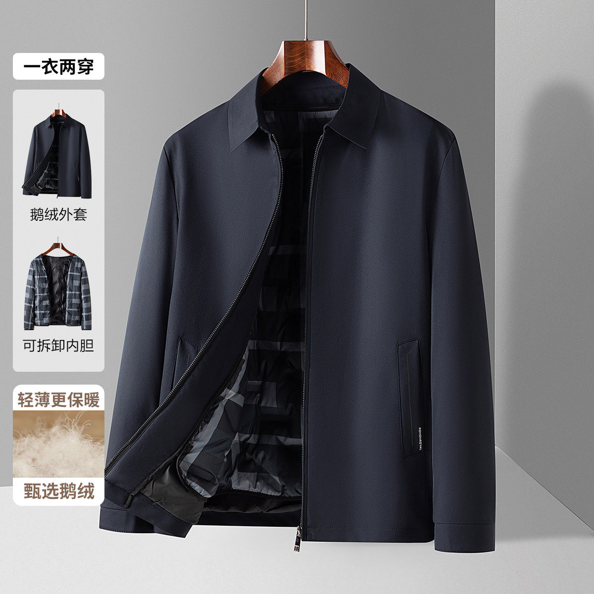 罗蒙男士鹅绒羽绒服可拆卸内胆行政中老年干部爸爸翻领夹克冬外套