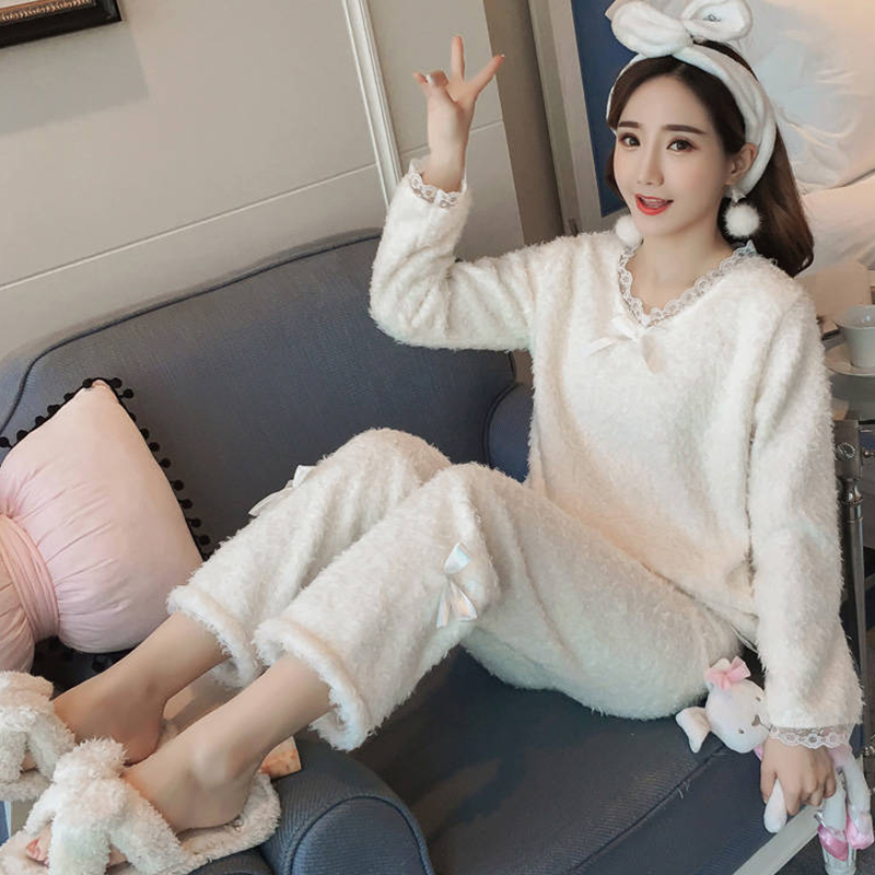 珊瑚绒睡衣女冬天甜美可爱毛绒绒蝴蝶结加绒加厚保暖樱桃绒家居服