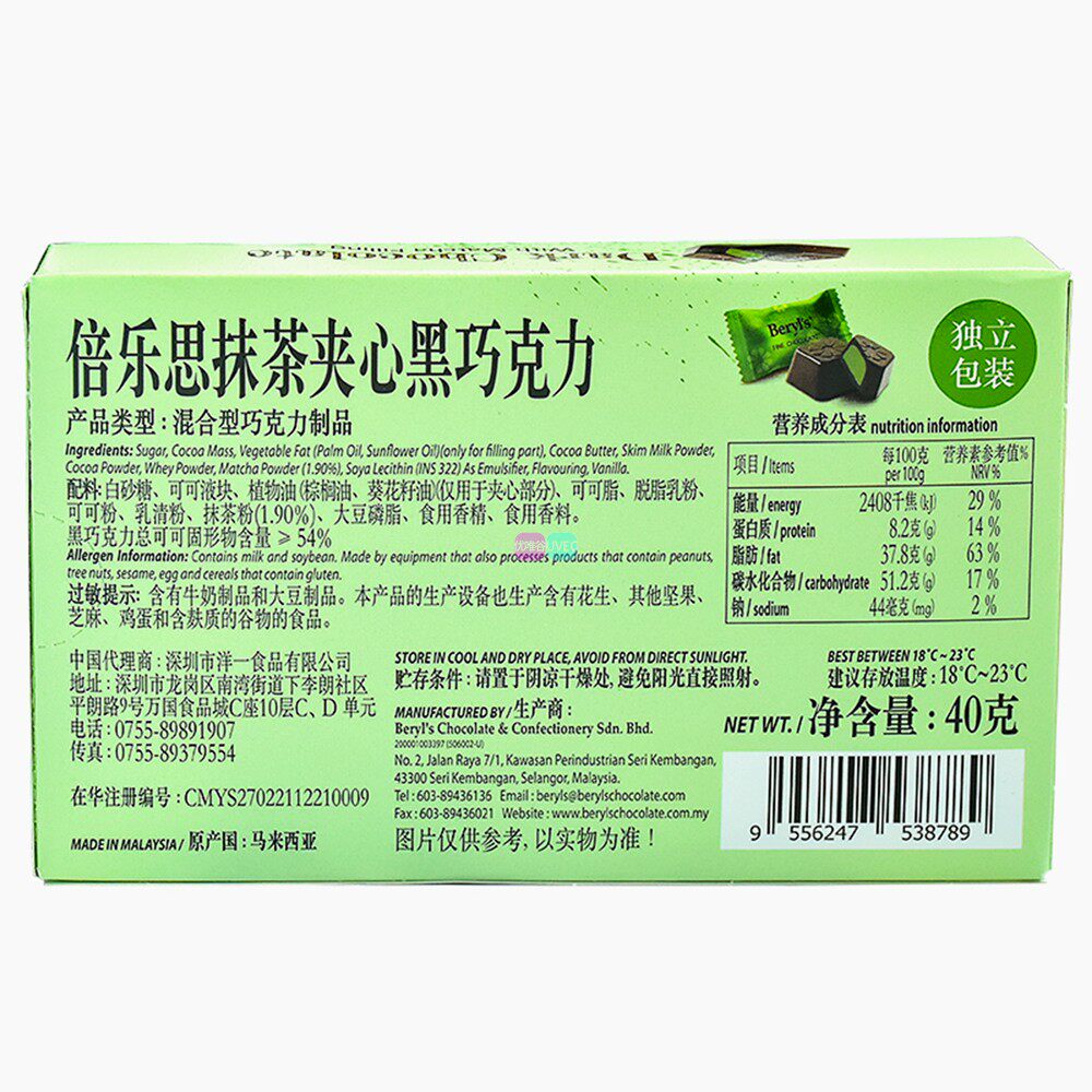 马来西亚原装进口零食Beryls倍乐思绿茶抹茶夹心黑巧克力盒装40g