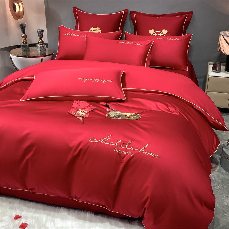 高级感红色婚庆四件套结婚床上刺绣婚嫁J出嫁女方喜被简约床单被