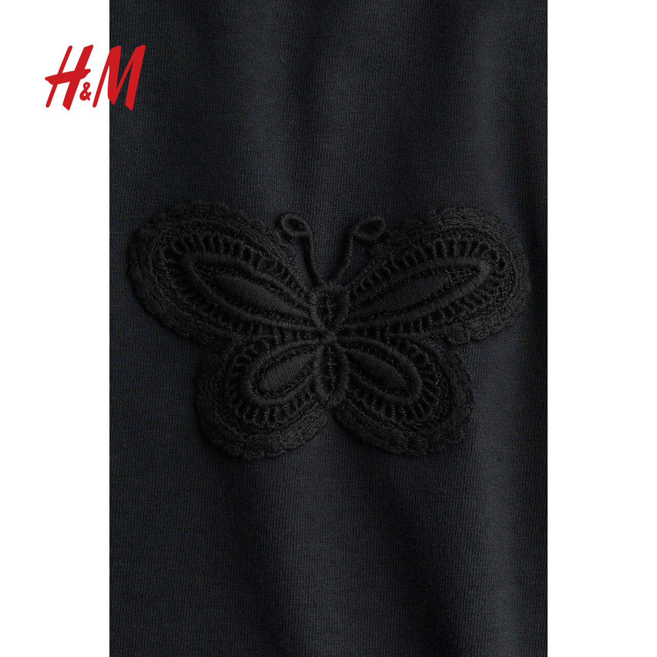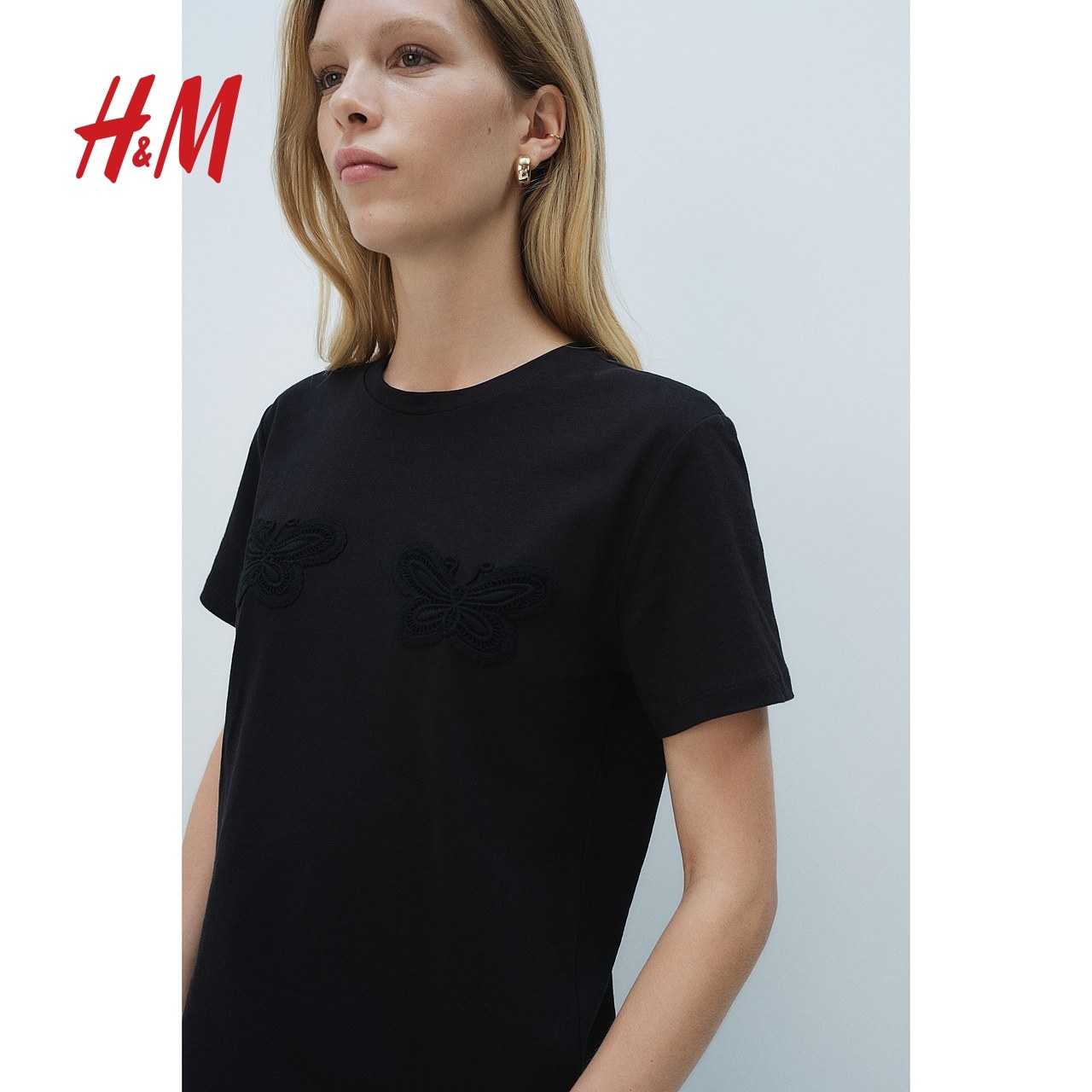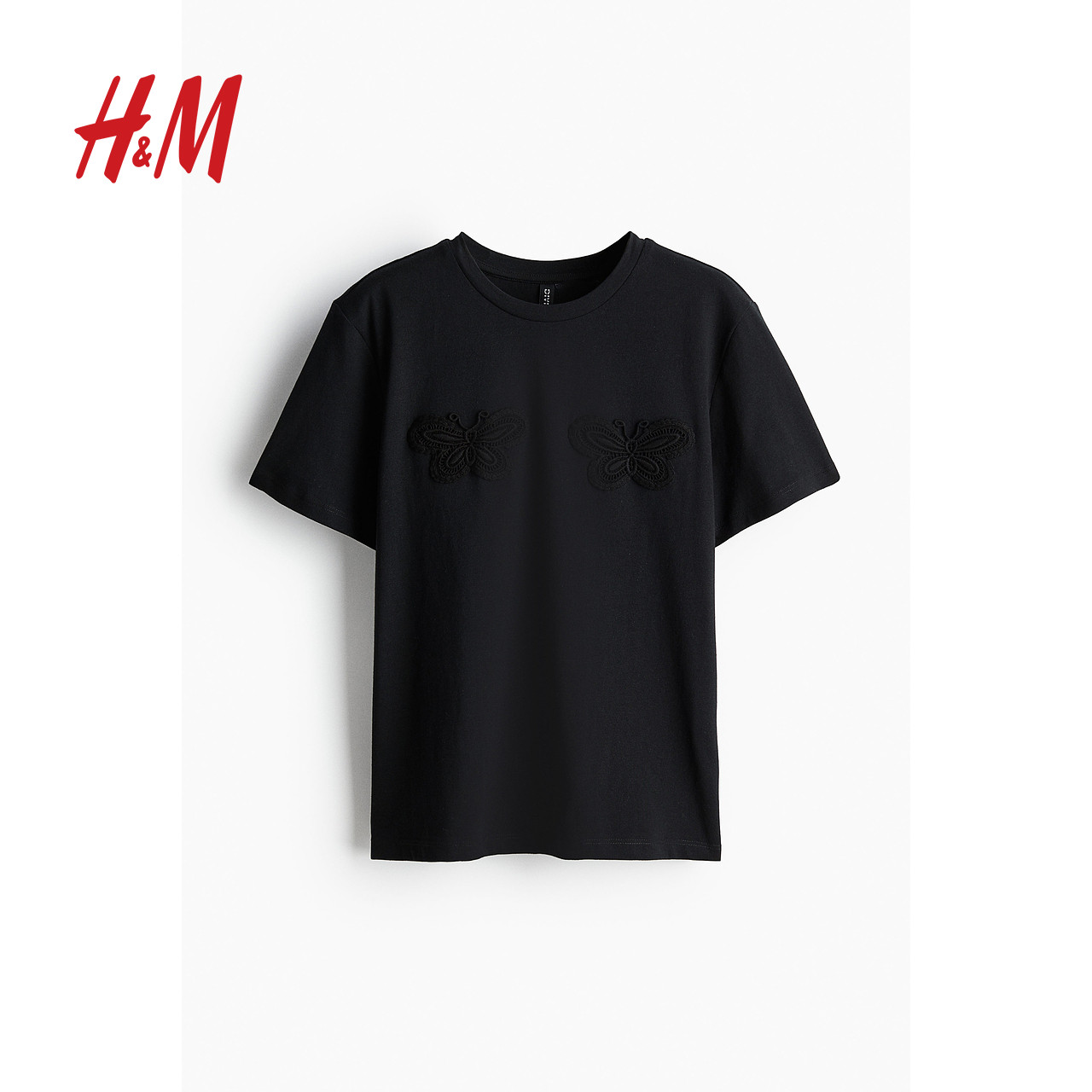 HM女装T恤春季宽松柔软舒适蝴蝶图案直筒短袖上衣1257979