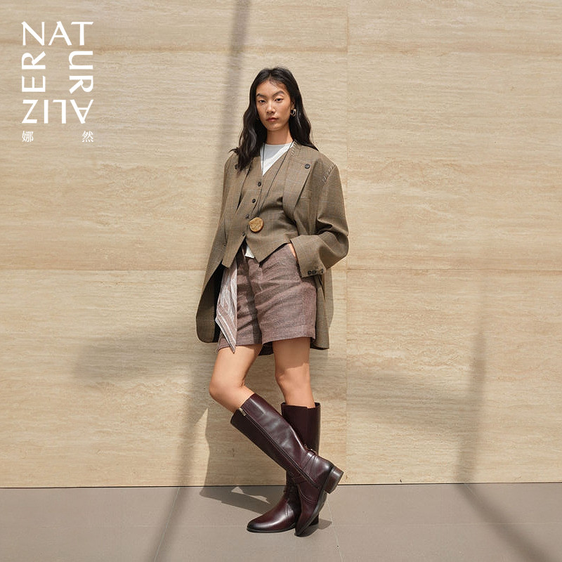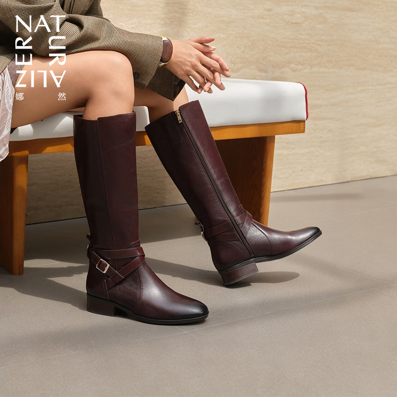 Naturalizer娜然2025冬低跟舒适平底保暖长筒机车骑士靴女RENA