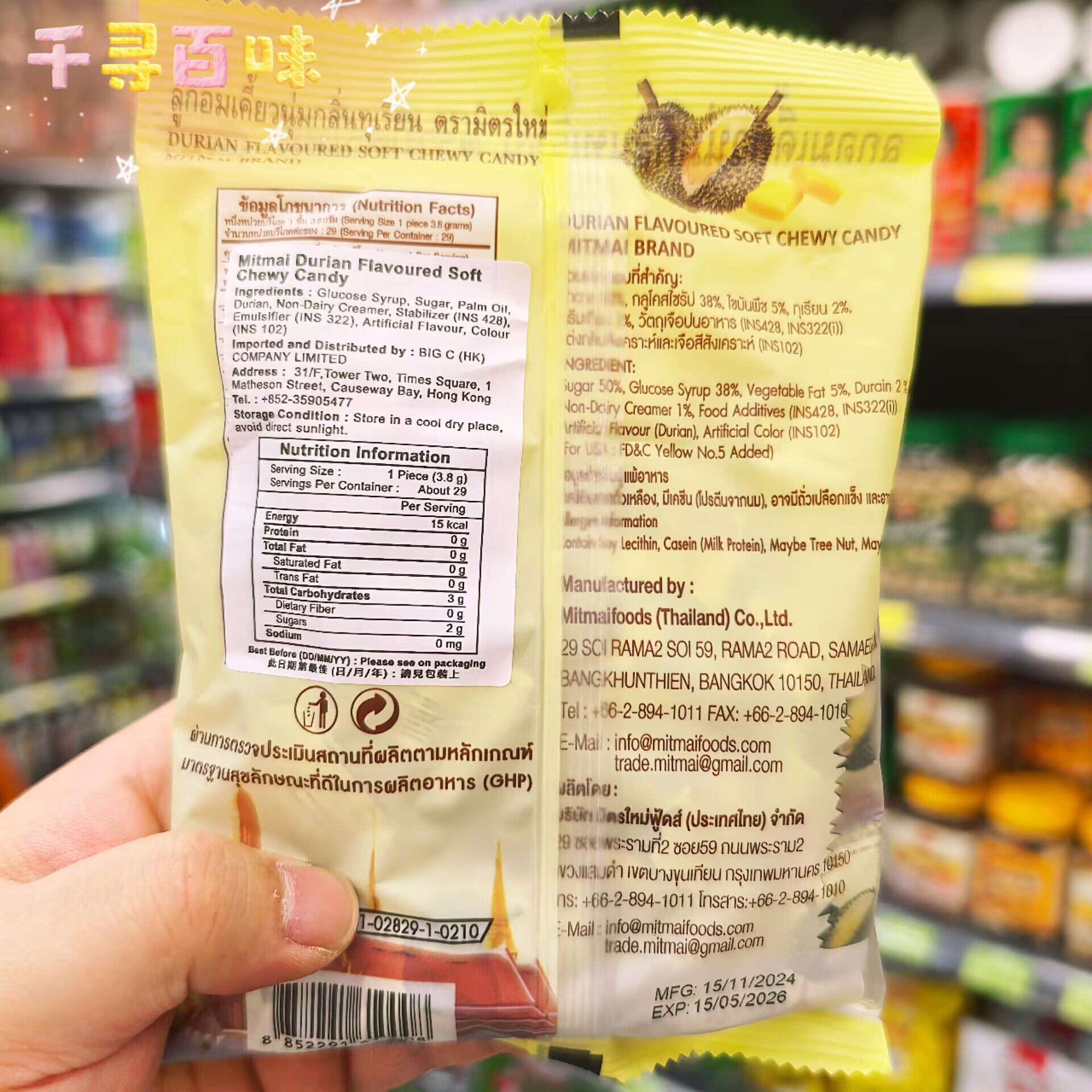 香港代购 泰国进口Mitmai山竹味糖榴莲味糖水果味糖独立包装110g