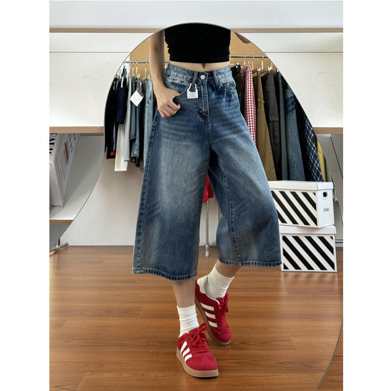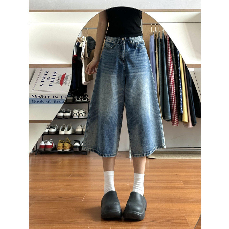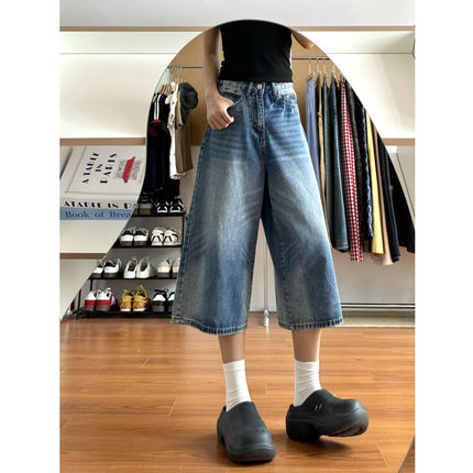 夏新款高街复古水洗直筒牛仔裤女设计感宽松垂感高腰阔腿七分裤子