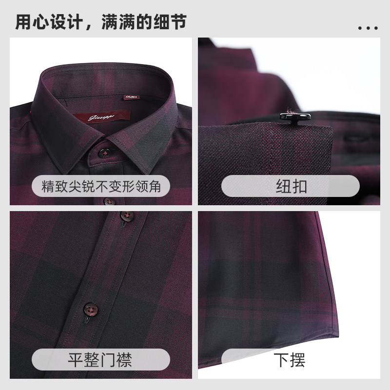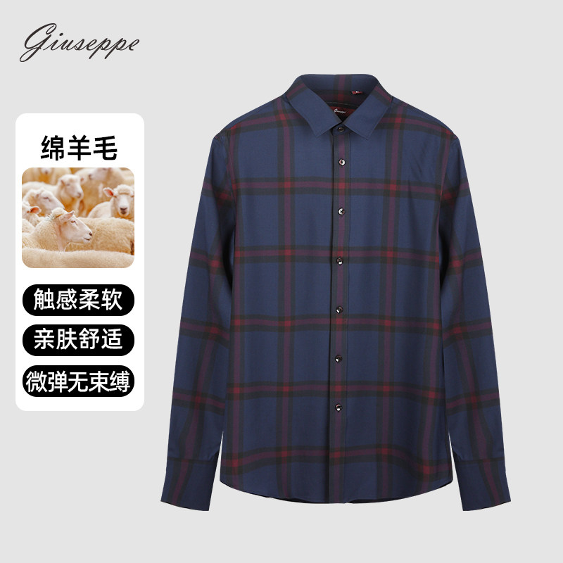 乔治白男士秋冬格纹羊毛混纺休闲通勤尖领微弹长袖衬衫