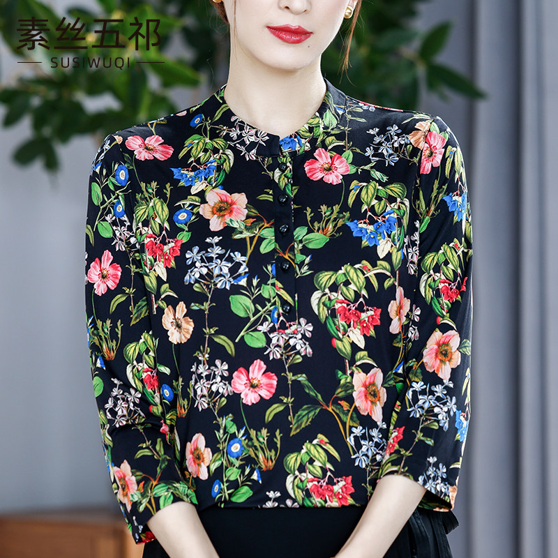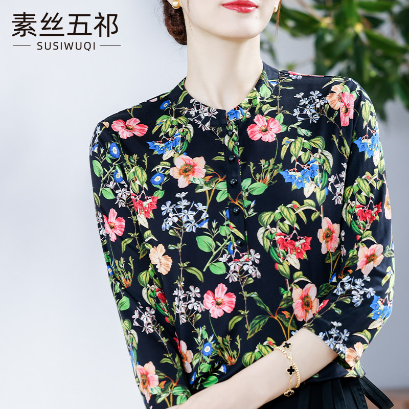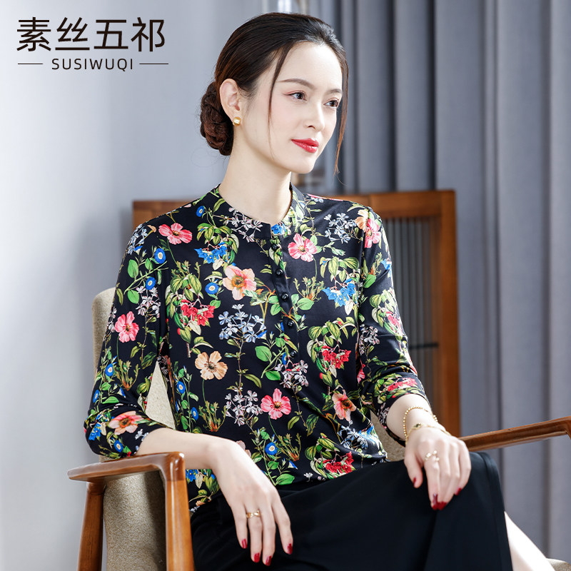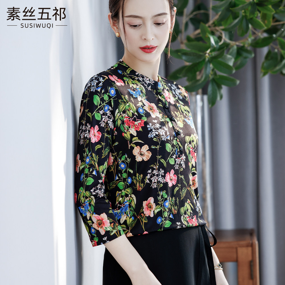 2024春秋新款 气质印花针织真丝上衣 7分袖桑蚕丝衬衫 国风女装