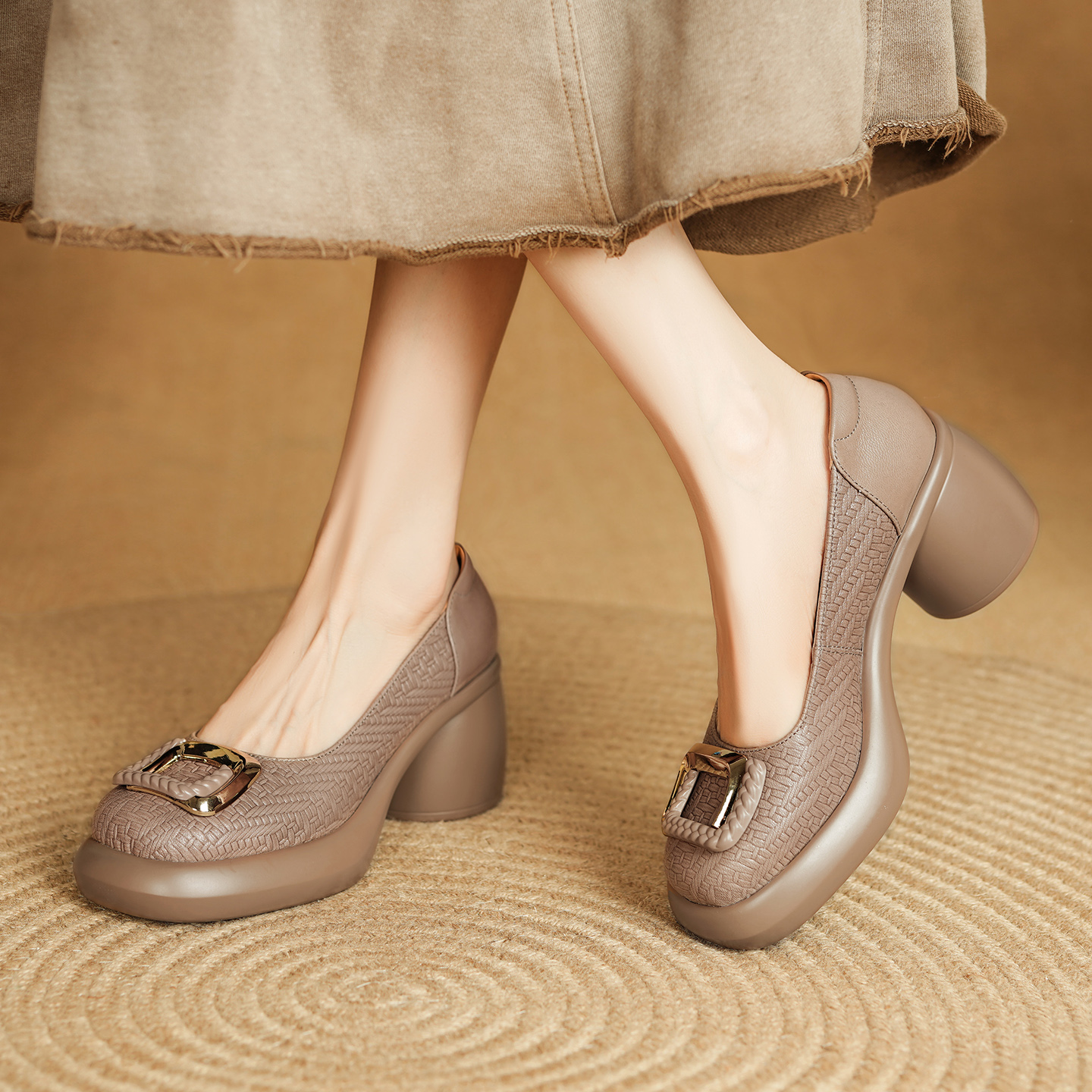 7.5cm真皮厚底单鞋女2025新款粗跟不累脚高跟鞋百搭圆头浅口女鞋