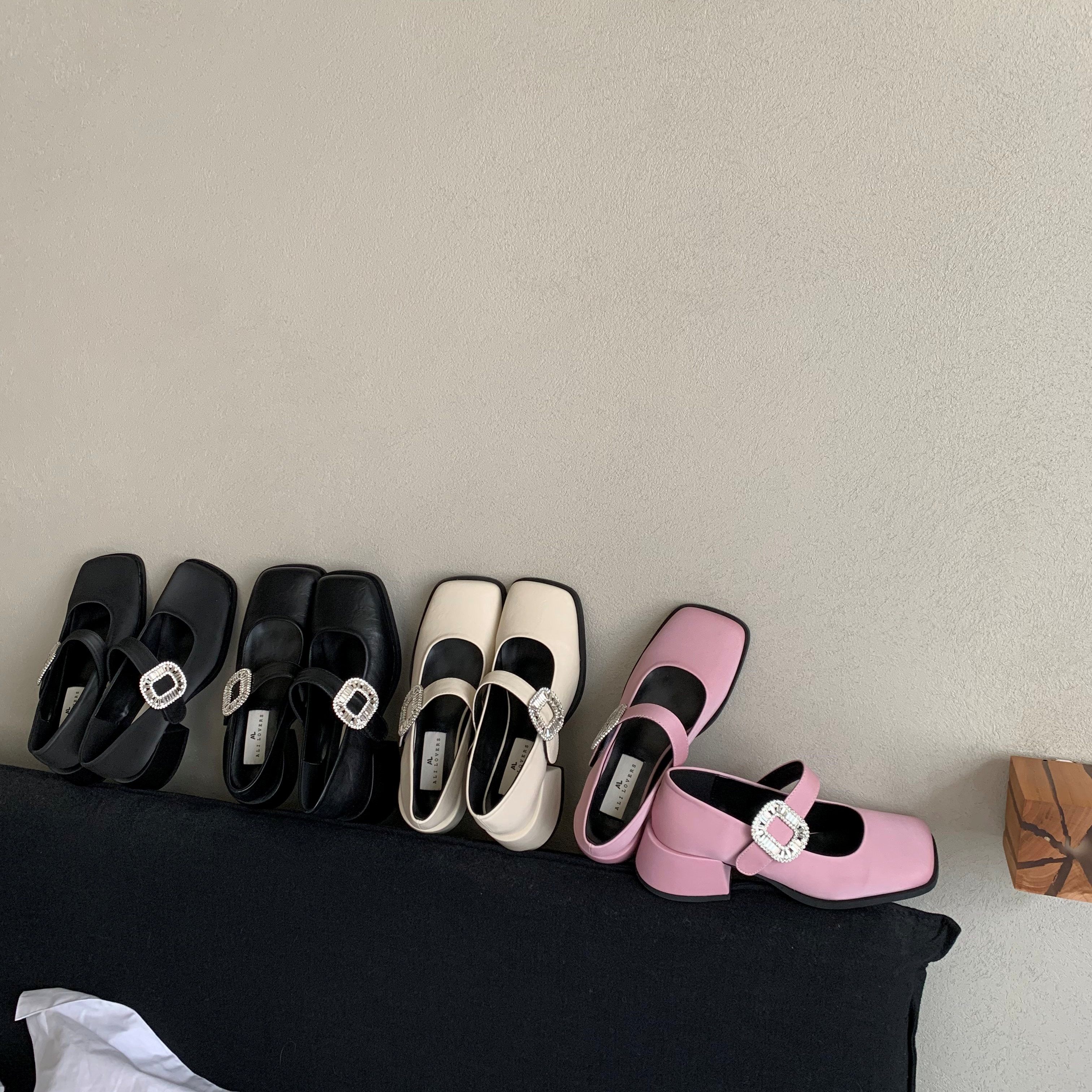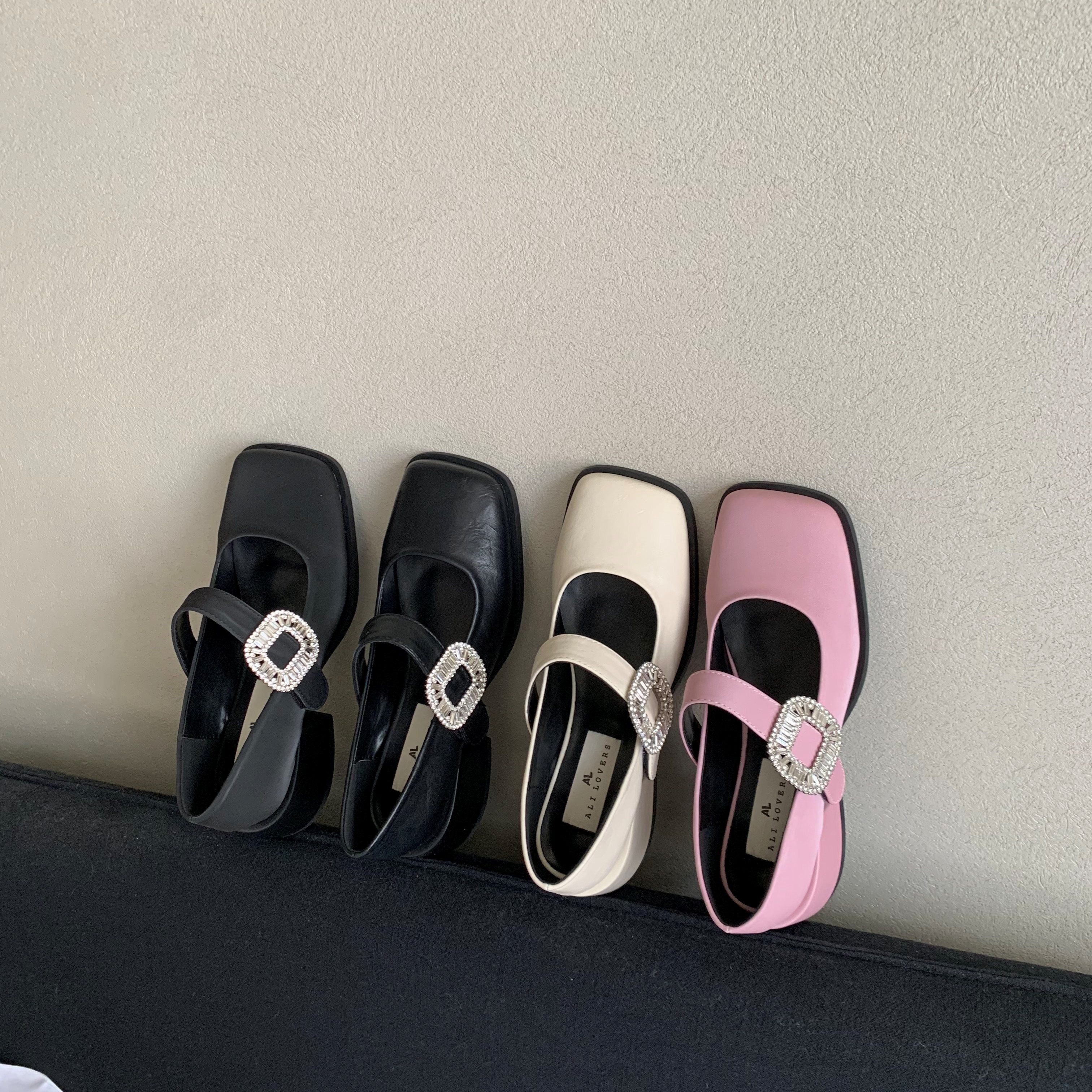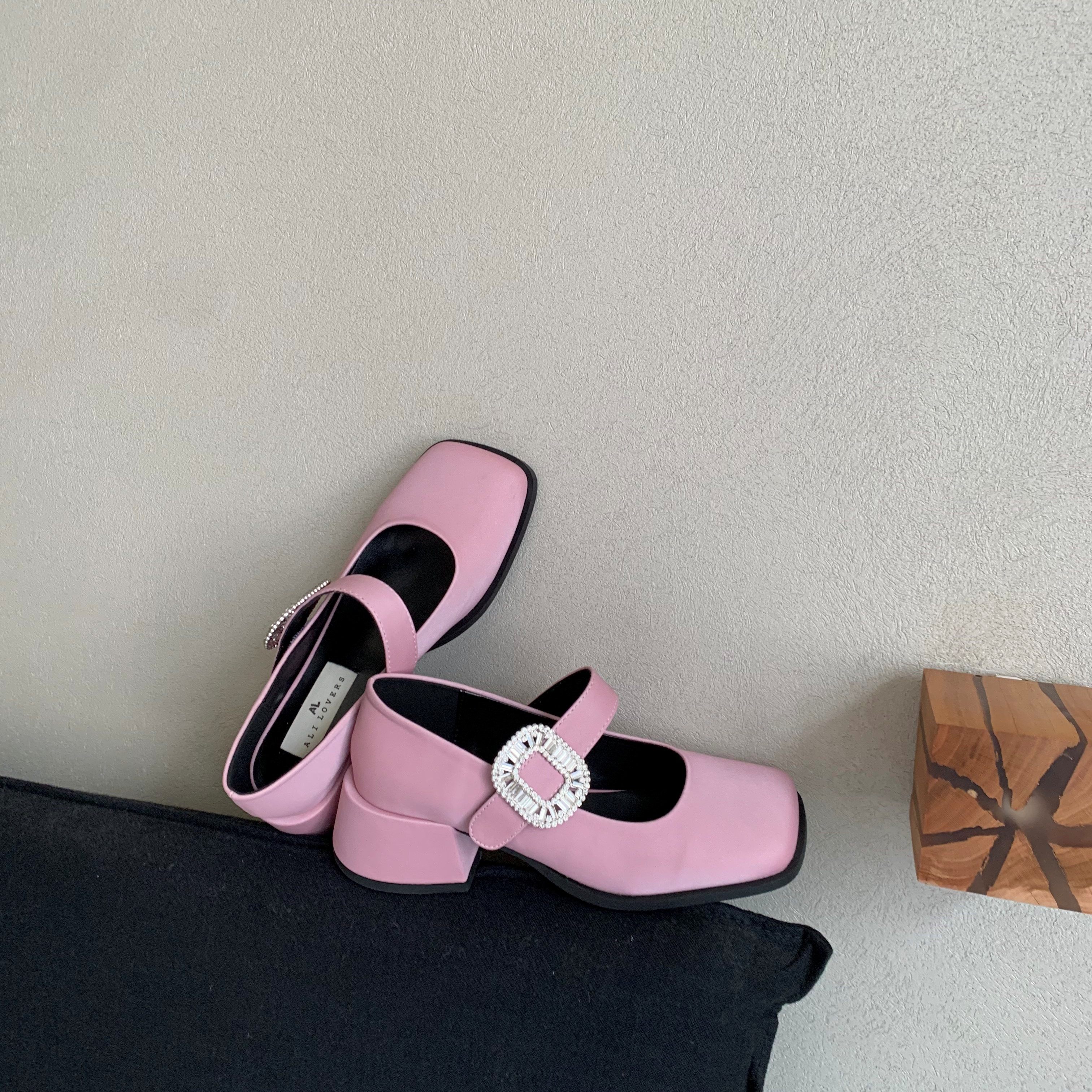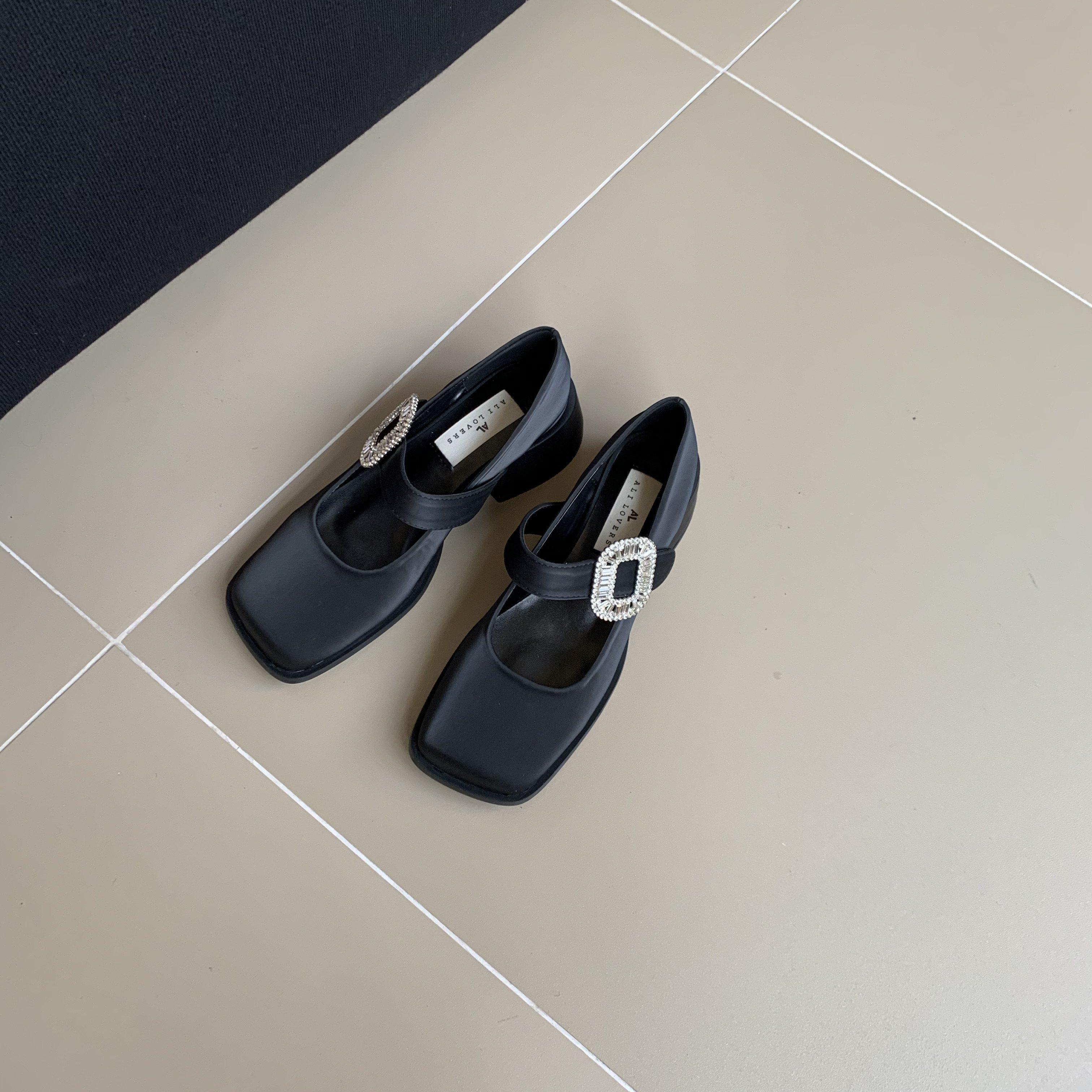 甜美风水钻方扣玛丽珍粗跟浅口鞋
