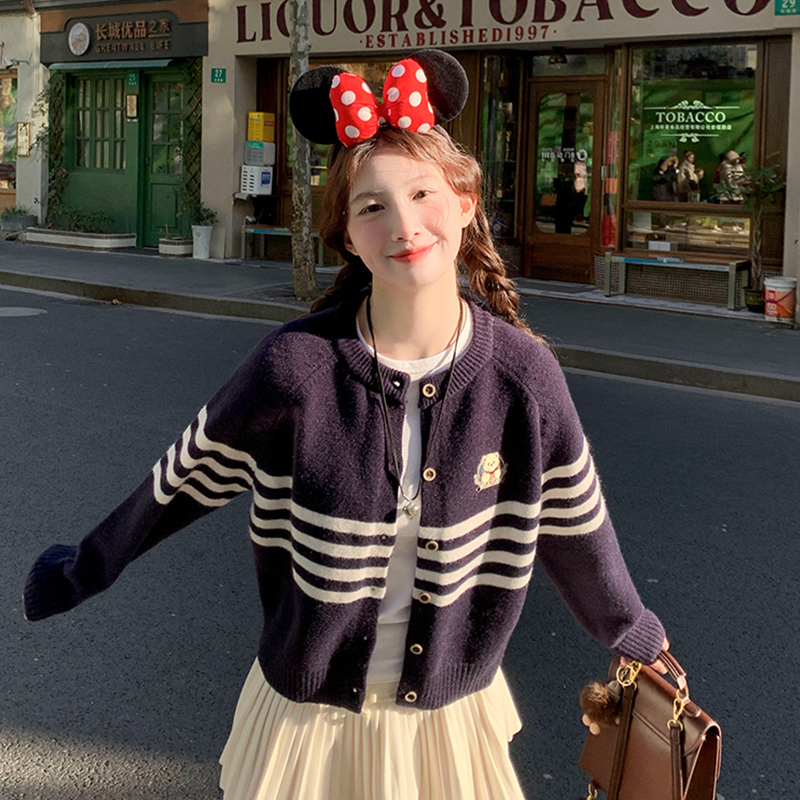 龙妹家圆领条纹针织开衫毛衣女款外穿2025秋冬新款学院风外套上衣