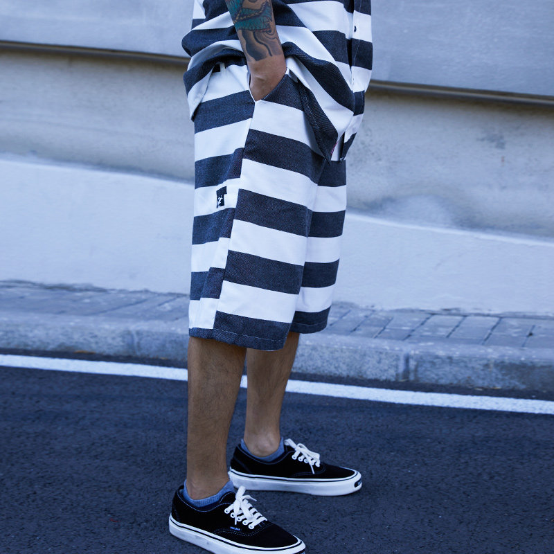 核爆炸潮牌黑白条纹纯狱风囚服匪帮机车休闲宽松大码工装六分短裤
