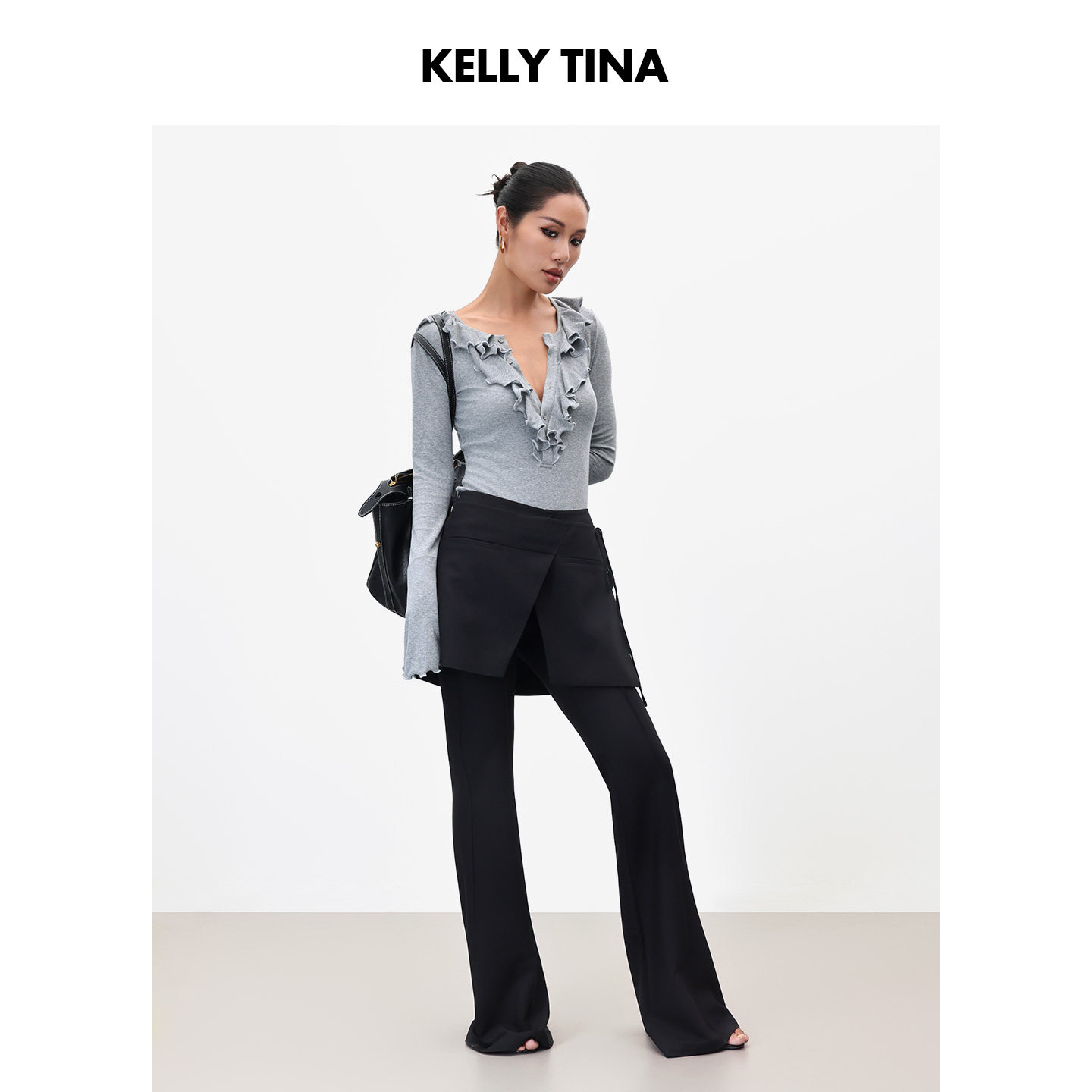黑色微喇裤长裤女修气质显瘦