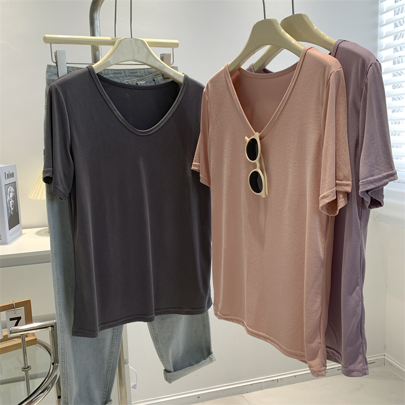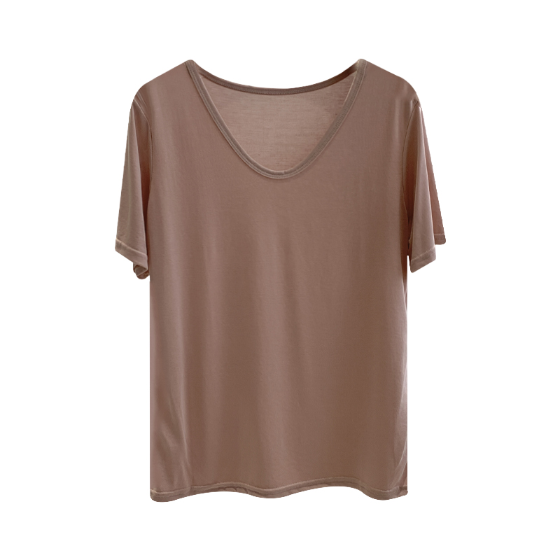 夏季薄款大U领铜氨丝短袖T恤女丝滑纯色基础款韩版上衣打底衫女