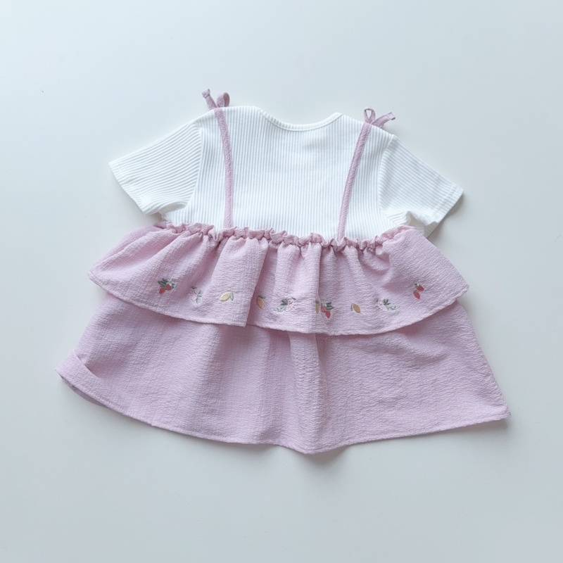日系童装80-130女孩夏季螺纹短袖T恤吊带假两件刺绣小蝴蝶结上衣