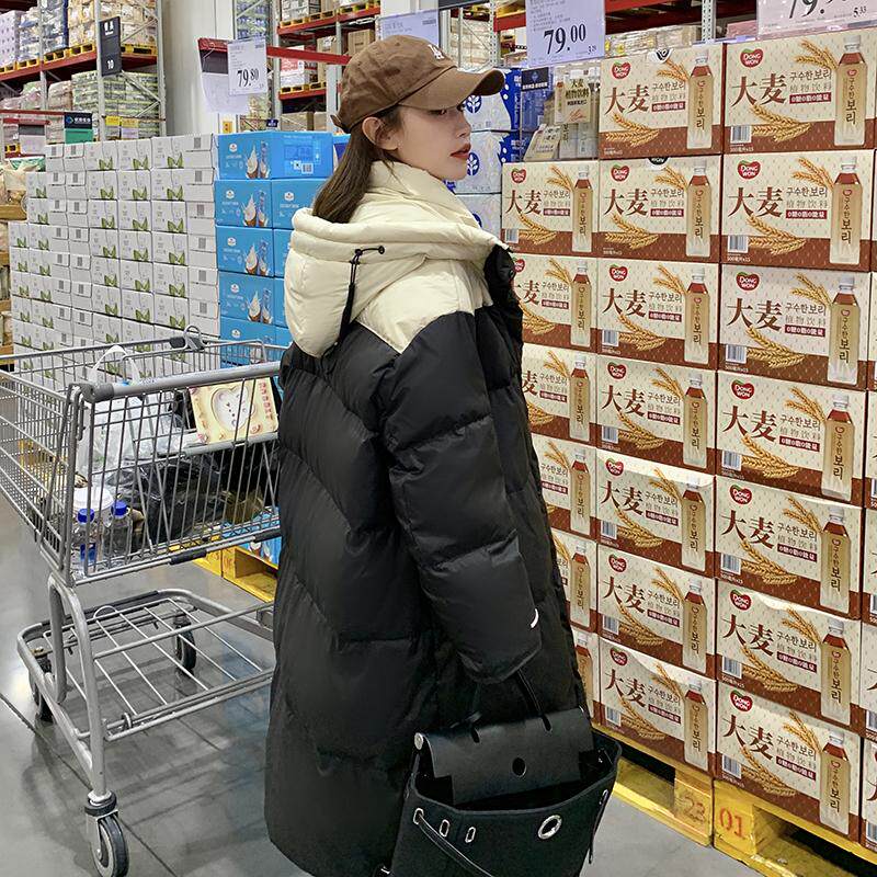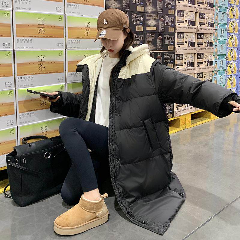 撞色拼接过膝长款外套女2024冬季新款90白鸭绒宽松保暖百搭羽绒服