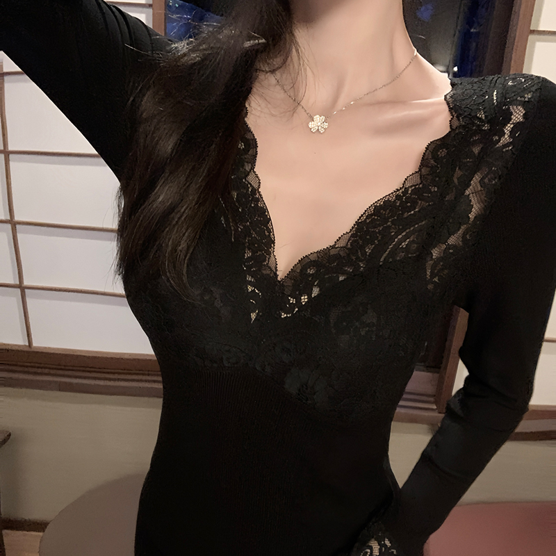 韩雨嘉【韩模感打底】白色纯欲蕾丝v领秋冬加绒内搭带胸垫保暖衣
