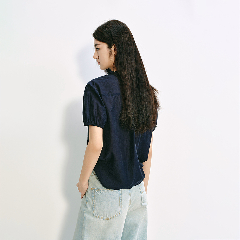 ochirly欧时力 莱赛尔短袖衬衫女上衣宽松花边法式2025夏季新品