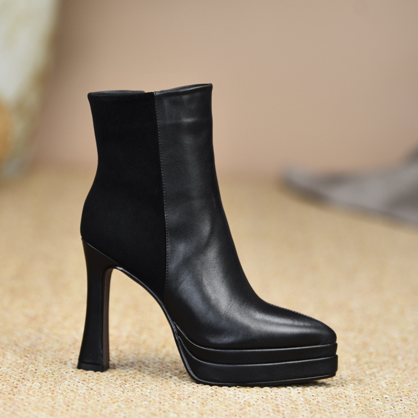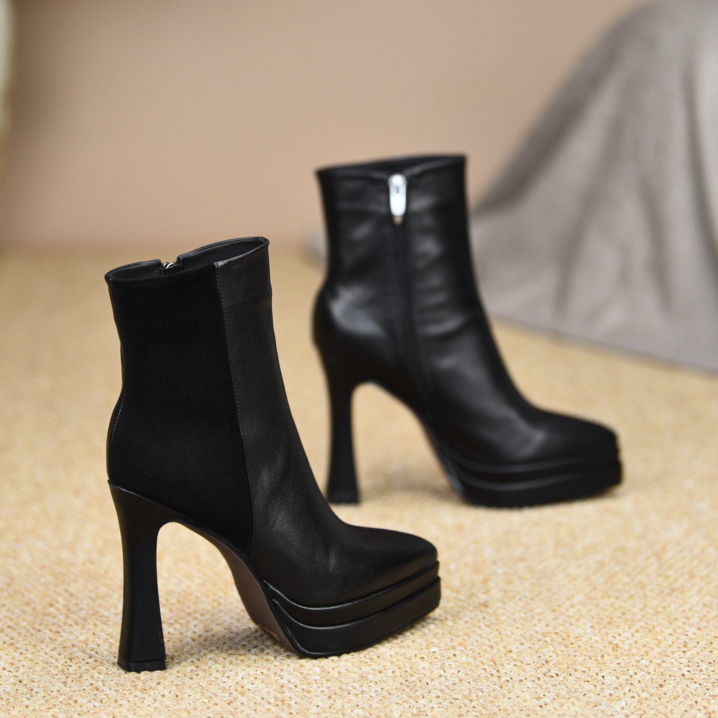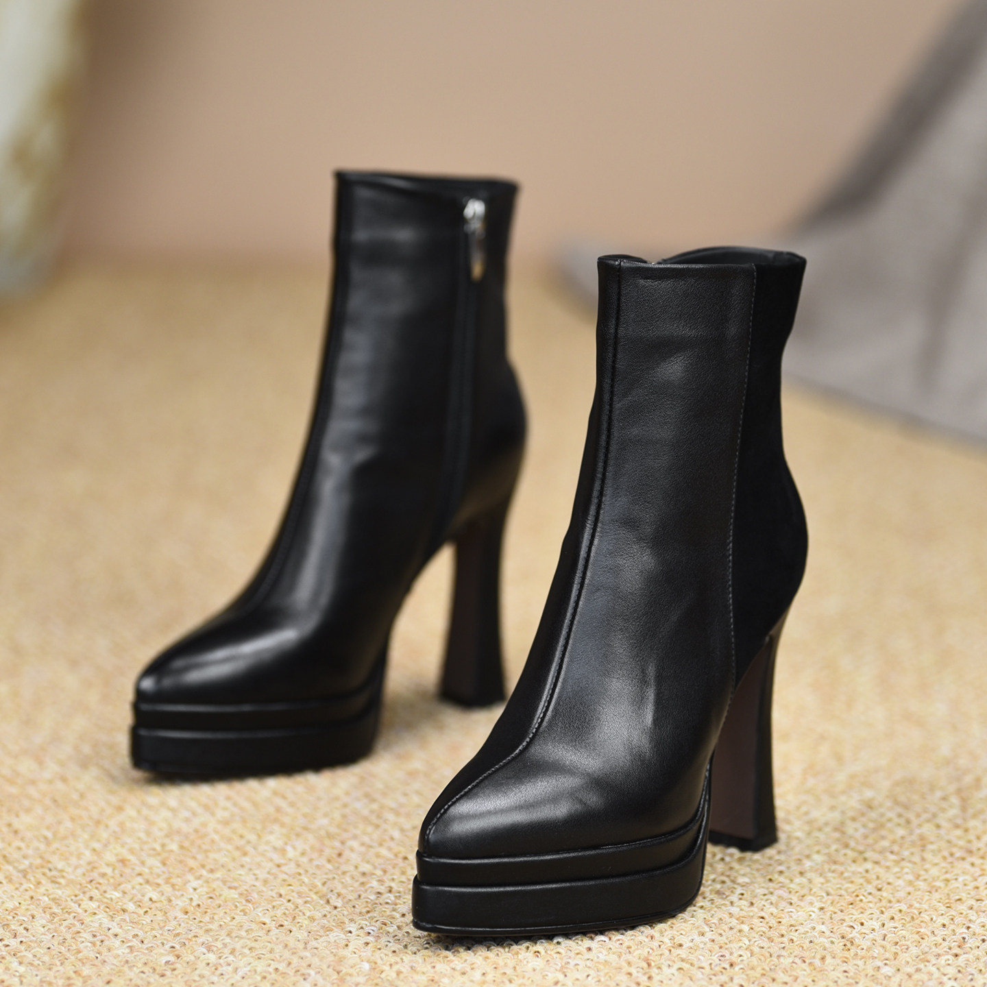 misili显瘦尖头粗跟短靴11.5cm高跟鞋2025秋冬新款厚底拼接女靴子