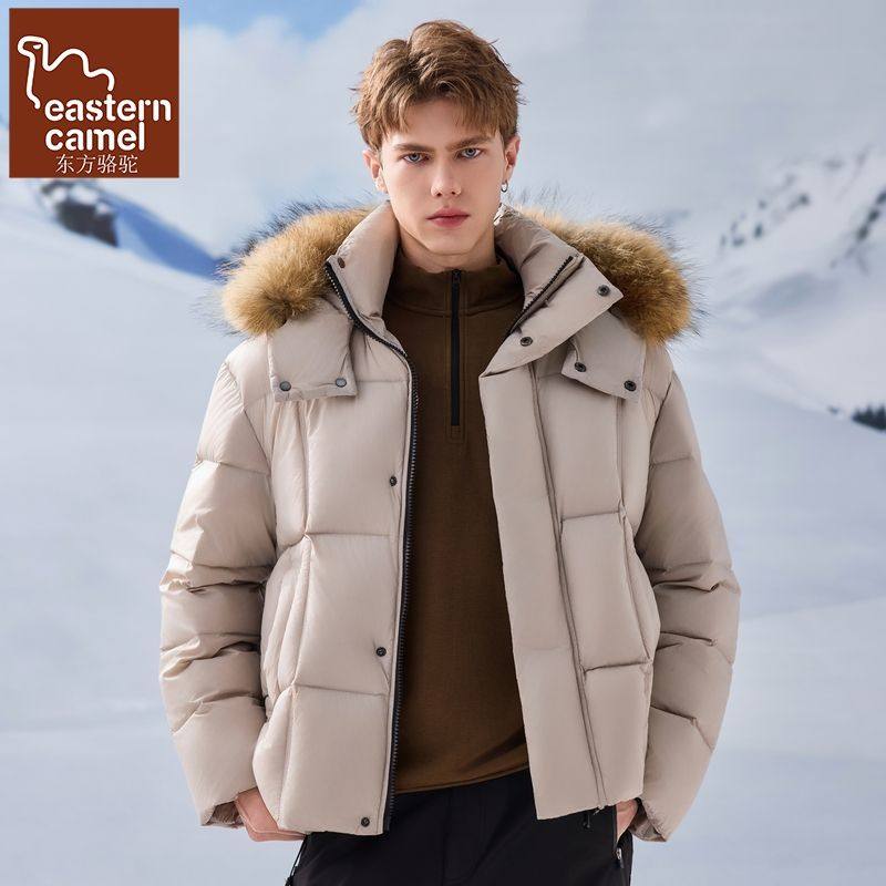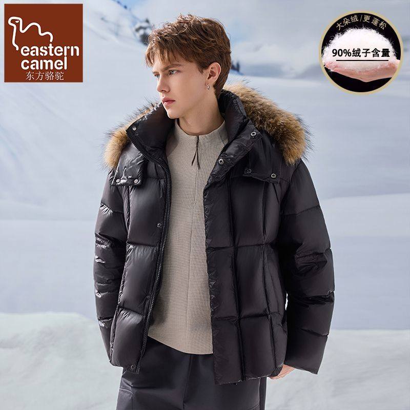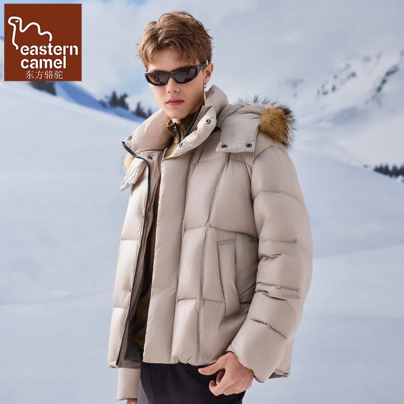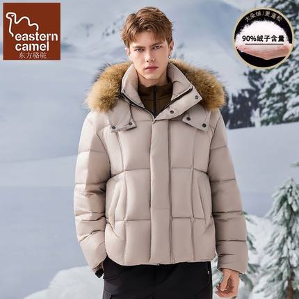东方骆驼冬季毛领连帽羽绒服男款美式90白鸭绒宽松辑格保暖外套男