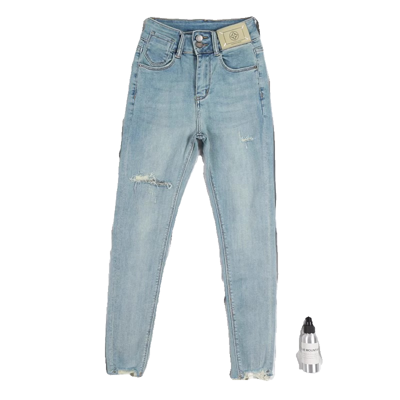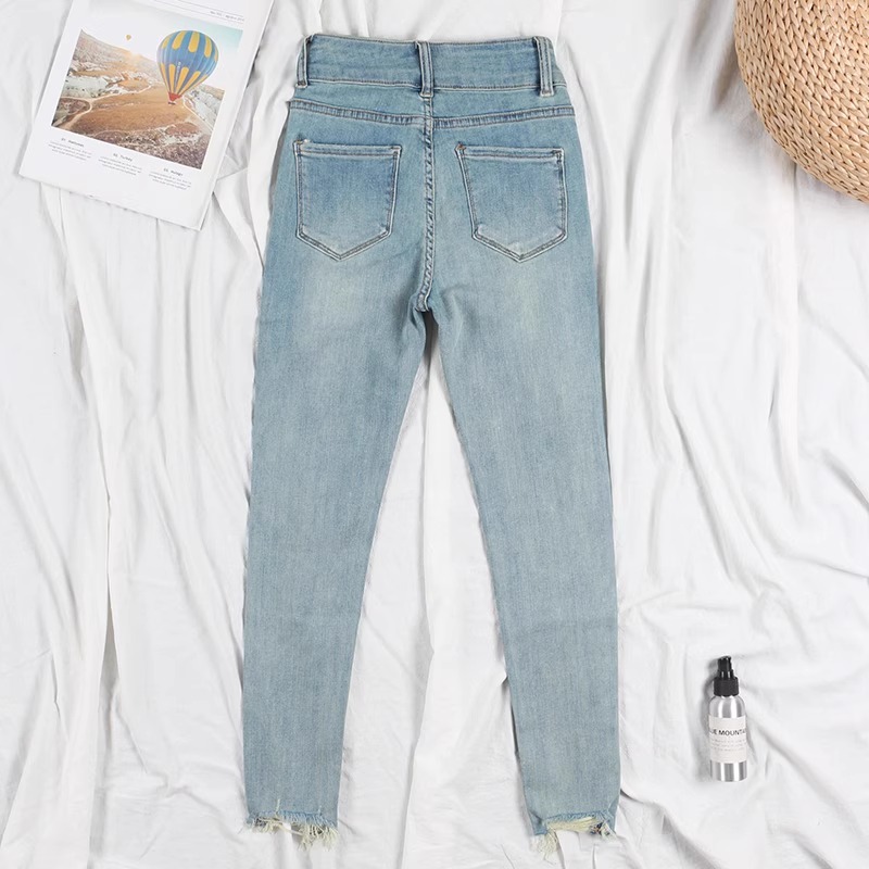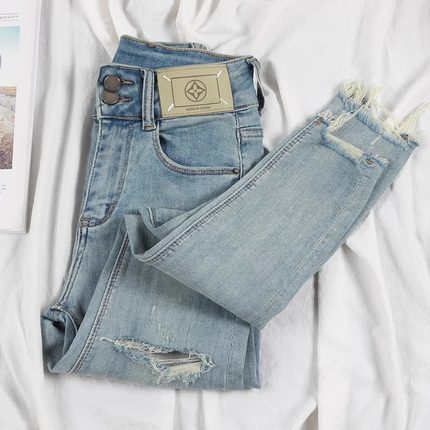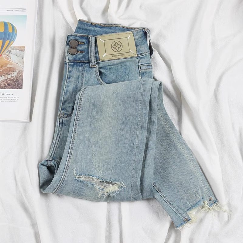 复古怀旧色2025新款春夏破洞牛仔铅笔裤女高腰修身显瘦九分小脚裤