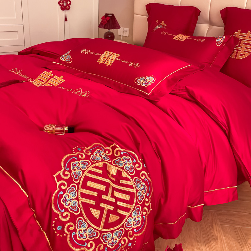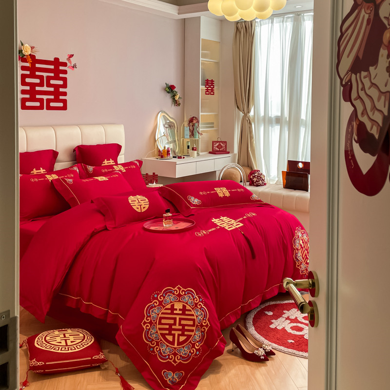 高档中式喜字结婚四件套大红色床单被套纯棉婚庆床上用品婚房喜被