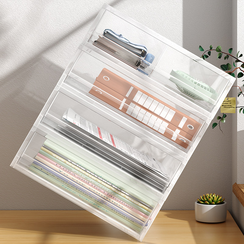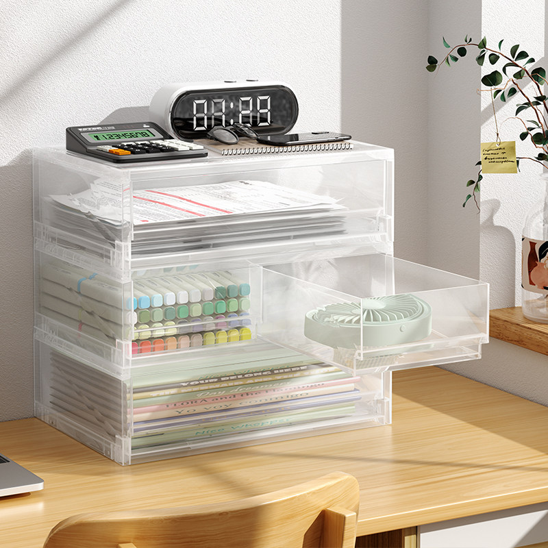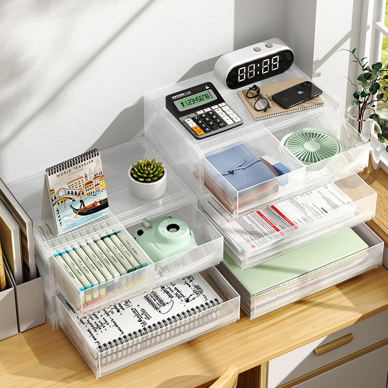 桌面收纳盒抽屉式透明办公室文件文具整理盒书架桌下分格置物架子