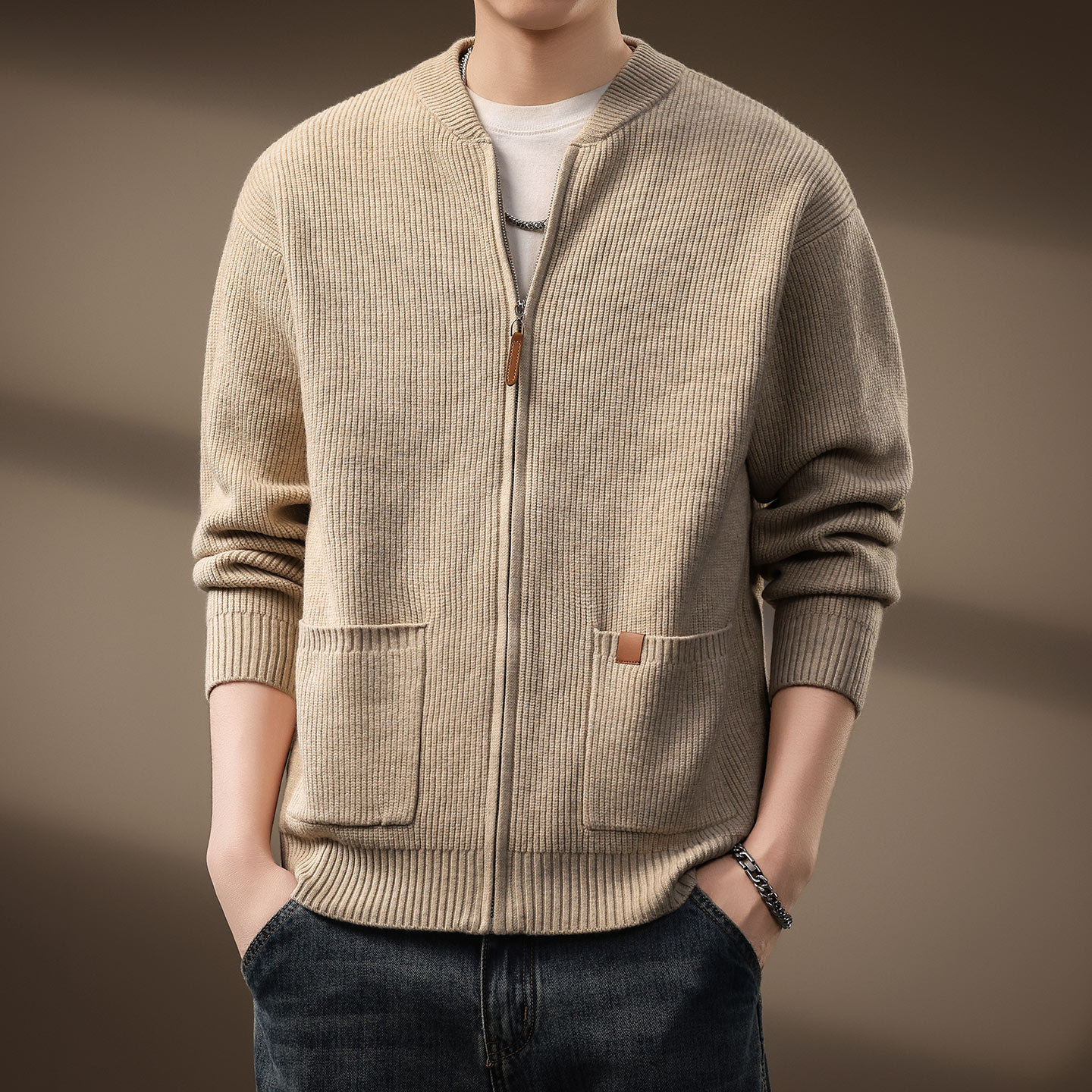 高端英伦休闲立领拉链开衫毛衣男冬季复古双口袋针织宽松百搭外套