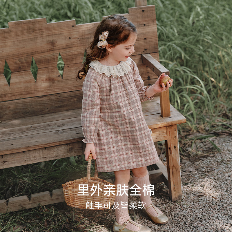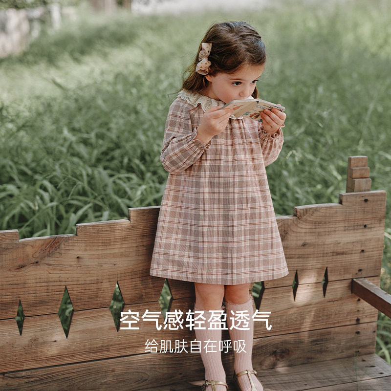 【新品】Oak Family儿童全棉长袖格子连衣裙绣花领女宝宝宽松裙子