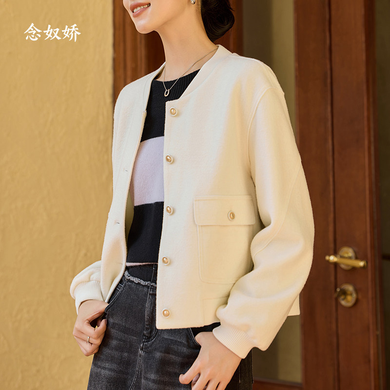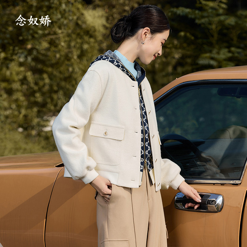 念奴娇米白色棒球服短外套2025秋冬女羊毛圈圈呢米色短上衣外套
