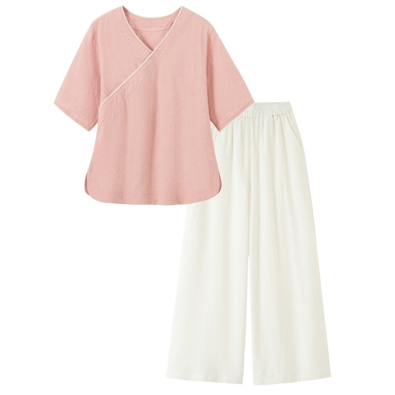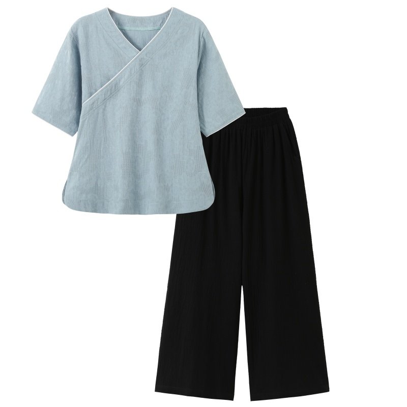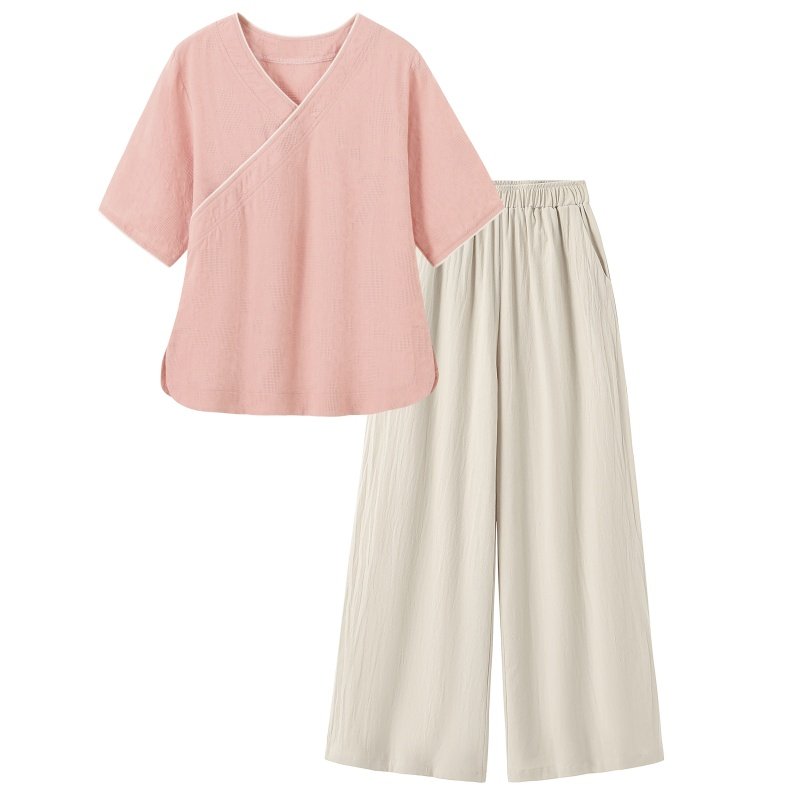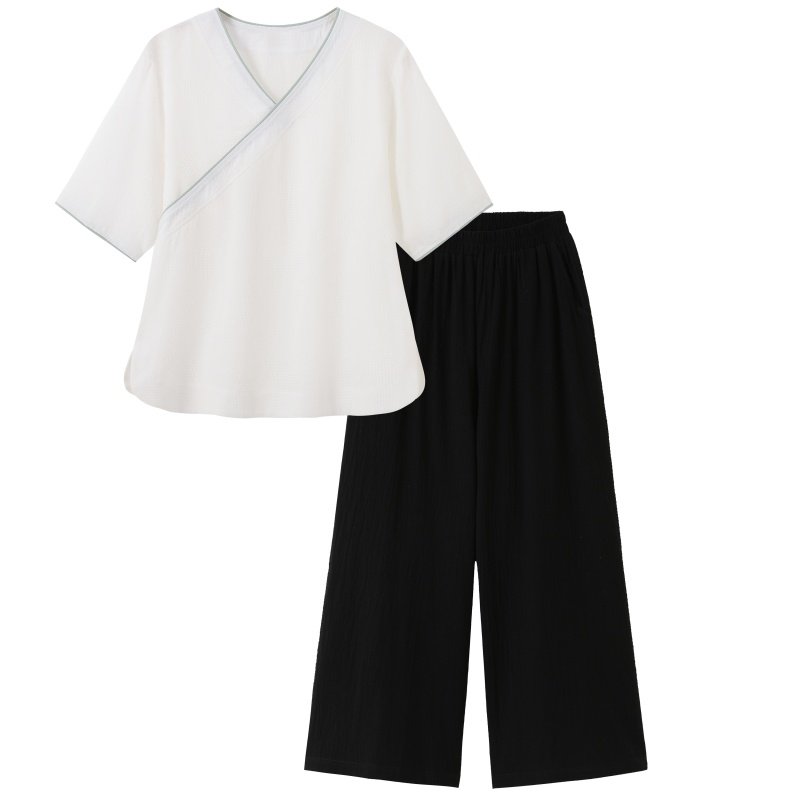 夏中国风文艺复古棉麻V领短袖上衣禅意茶服休闲阔腿裤两件套装女