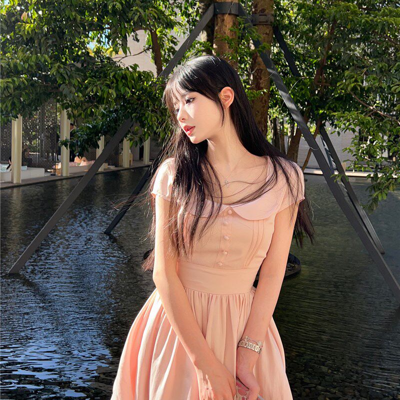 green大姐姐【粉显白茶】乖少女气质小百花娃娃领收腰连衣裙长款