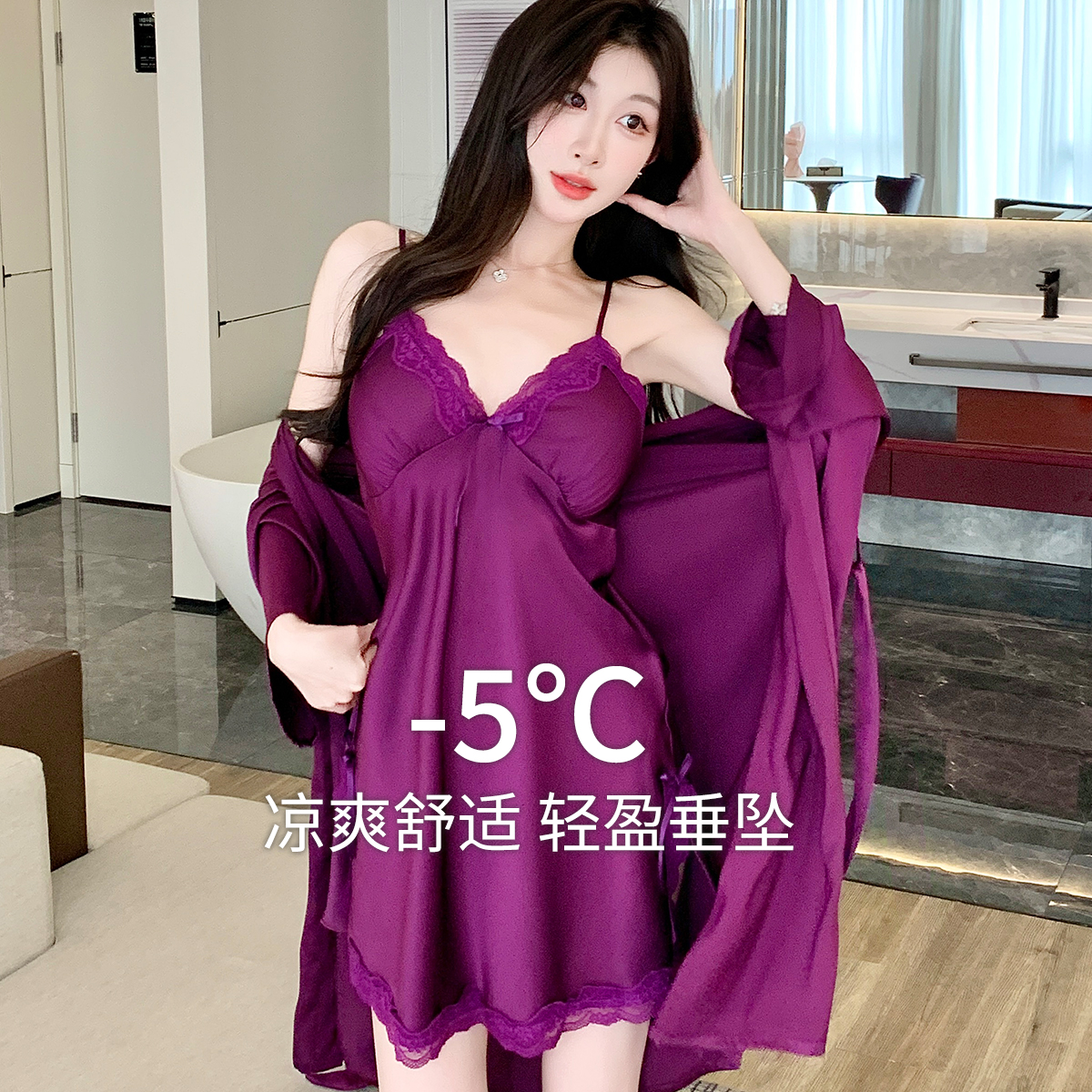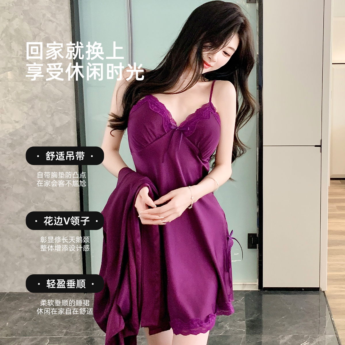 紫色少女款性感吊带睡衣女春夏季冰丝绸带胸垫睡裙睡袍浴袍家居服