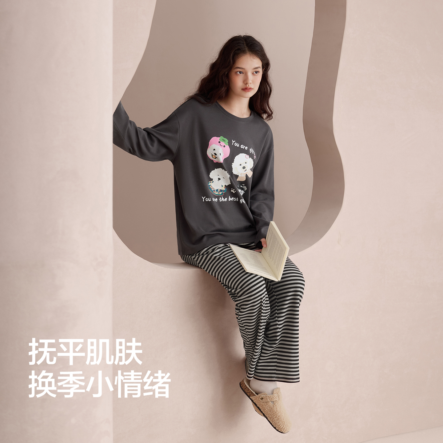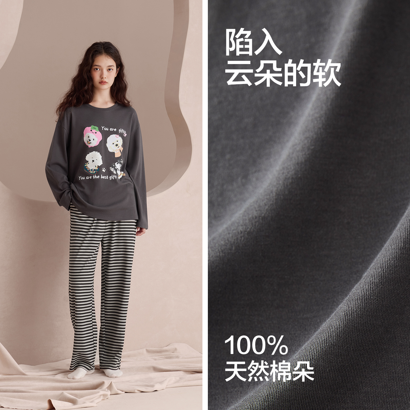 红豆女士纯棉睡衣长袖春秋新款卡通印花全棉A类可外穿家居服套装