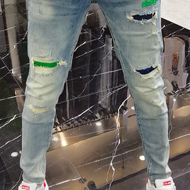 潮男秋季乞丐破洞牛仔裤男潮牌百搭贴标刺绣修身弹力百搭小脚裤子