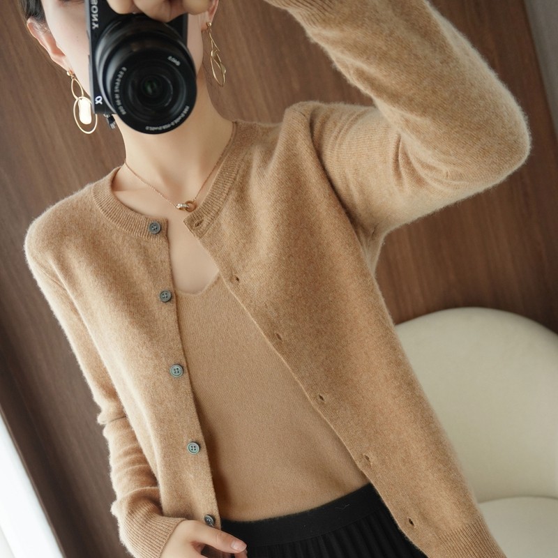 鄂尔多斯市100%羊绒衫女针织开衫宽松外穿洋气毛衣外套羊毛纯色女