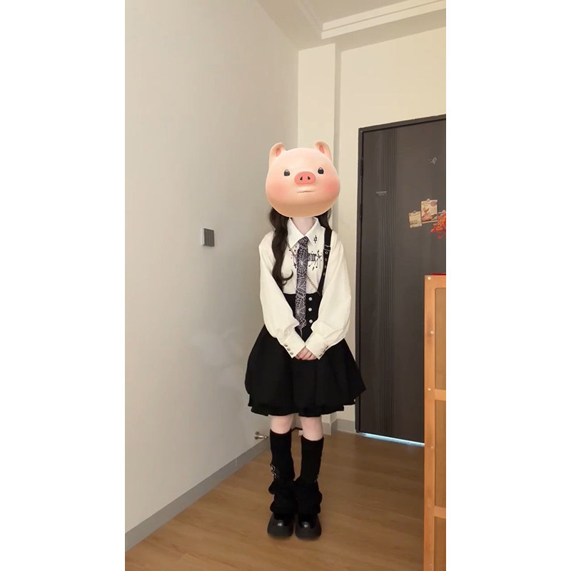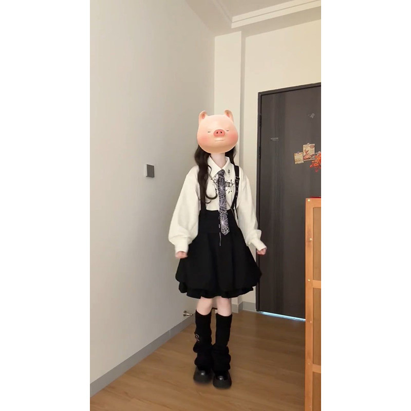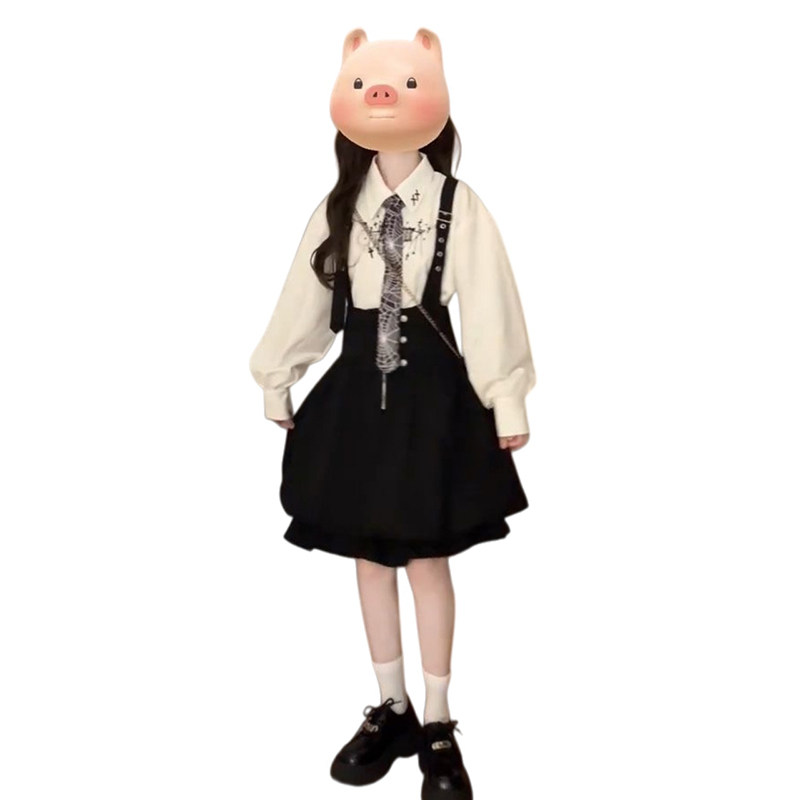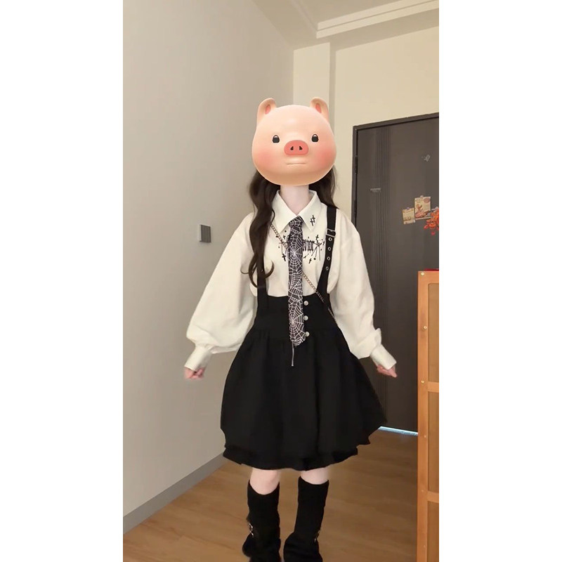 巨好看穿搭一整套学院风白色印花衬衫+时尚黑色花苞背带连衣裙女