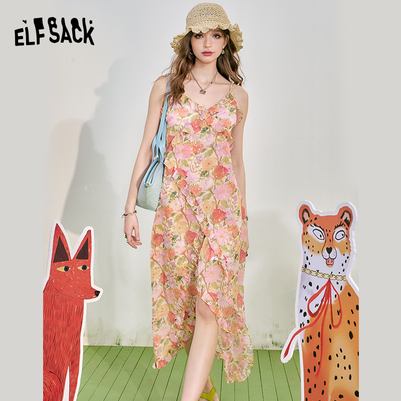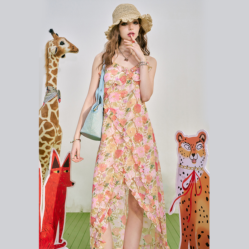 妖精的口袋木耳边开叉碎花吊带连衣裙女2025夏新款显瘦度假风裙子